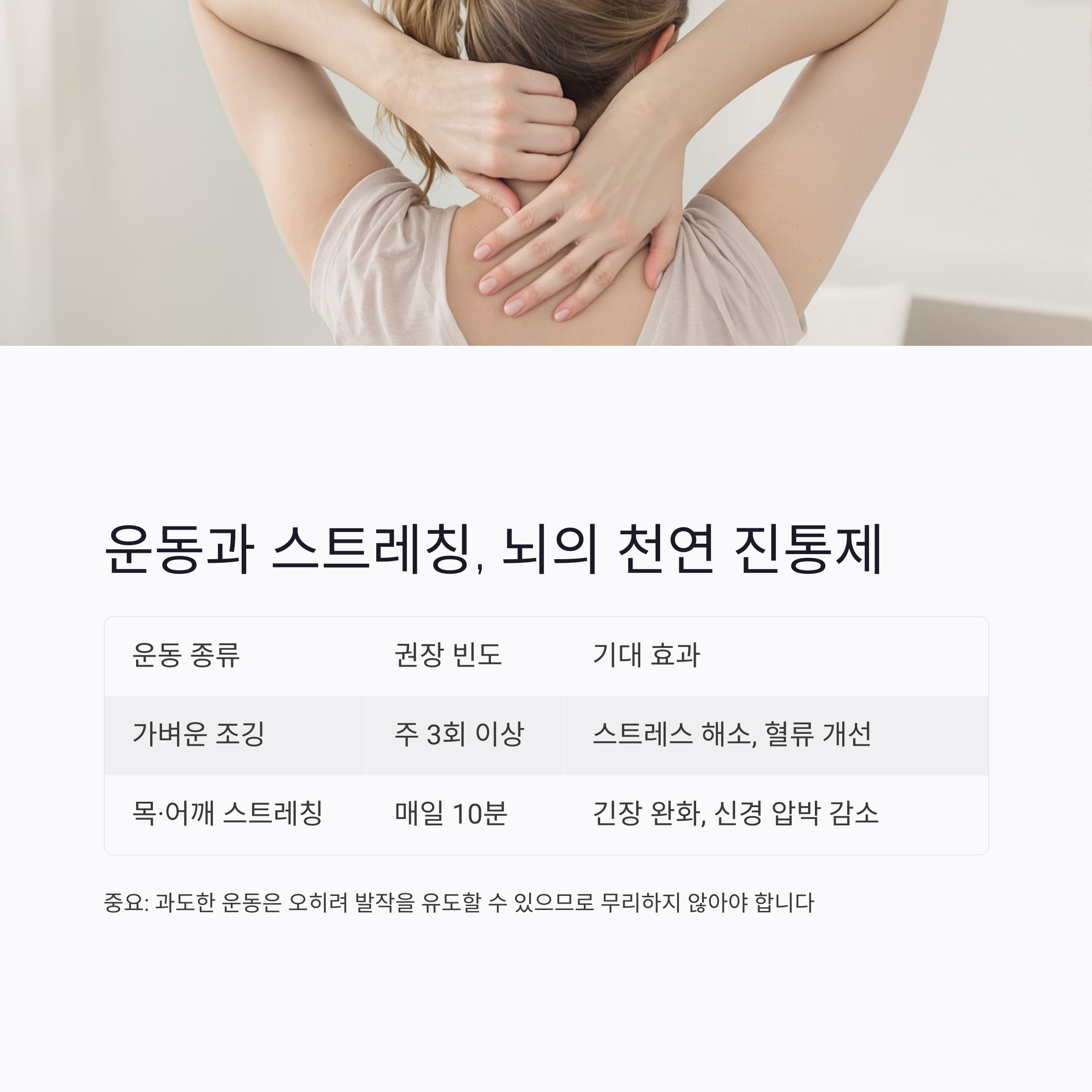 또한 근육 긴장을 완화하는 스트레칭은 혈류 순환 개선과 뇌압 조절에 큰 도움을 줍니다.