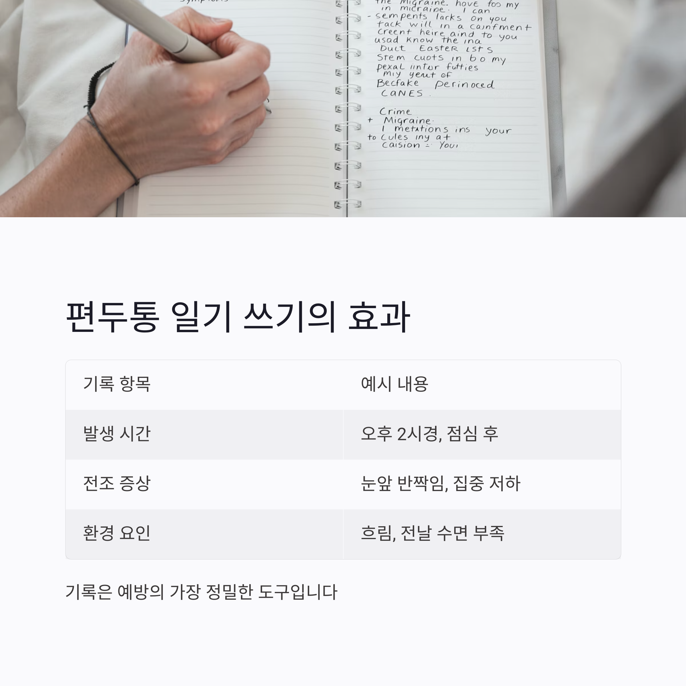 이 습관은 자신의 편두통 패턴을 파악하고 예방 전략을 세우는 데 큰 도움을 줍니다.