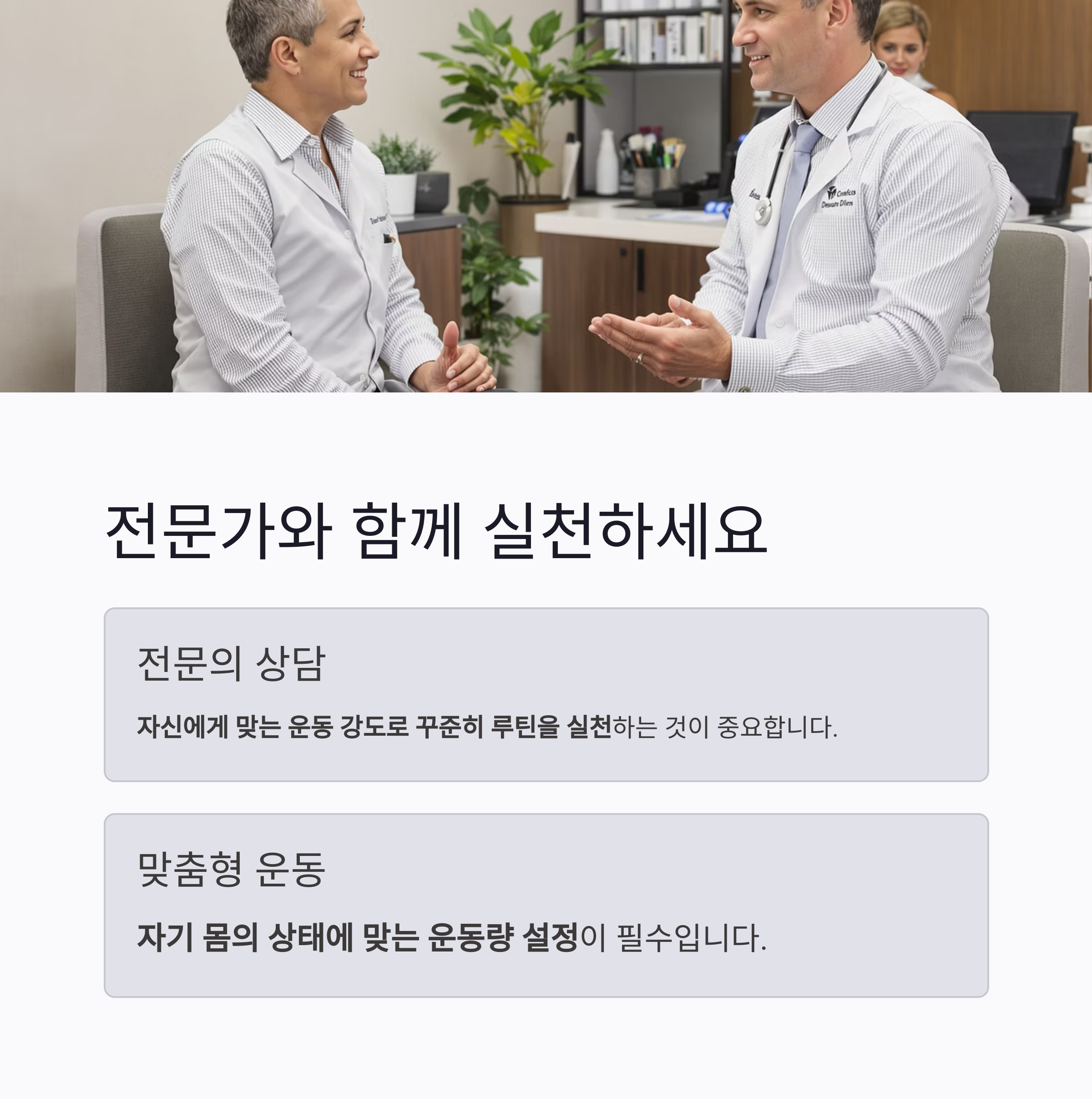 전문의와 상담 후 자신에게 맞는 운동 강도로 꾸준히 루틴을 실천하는 것이 가장 중요합니다.