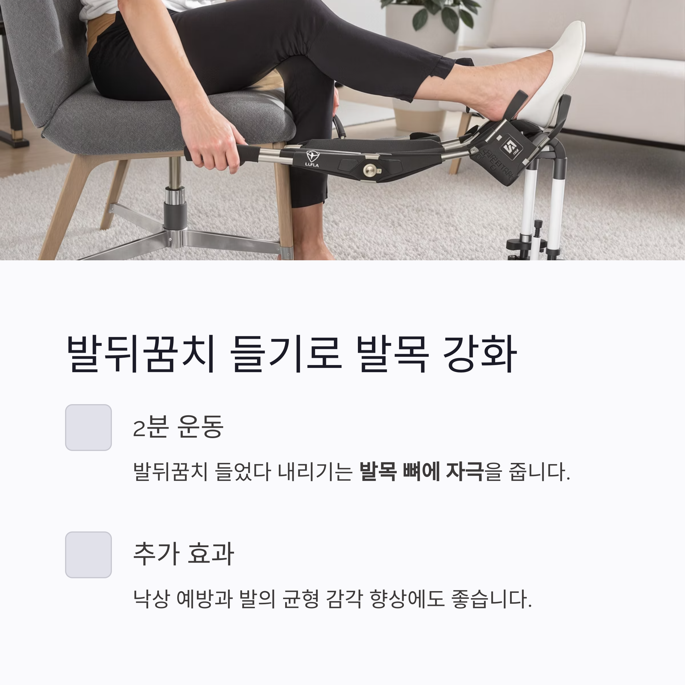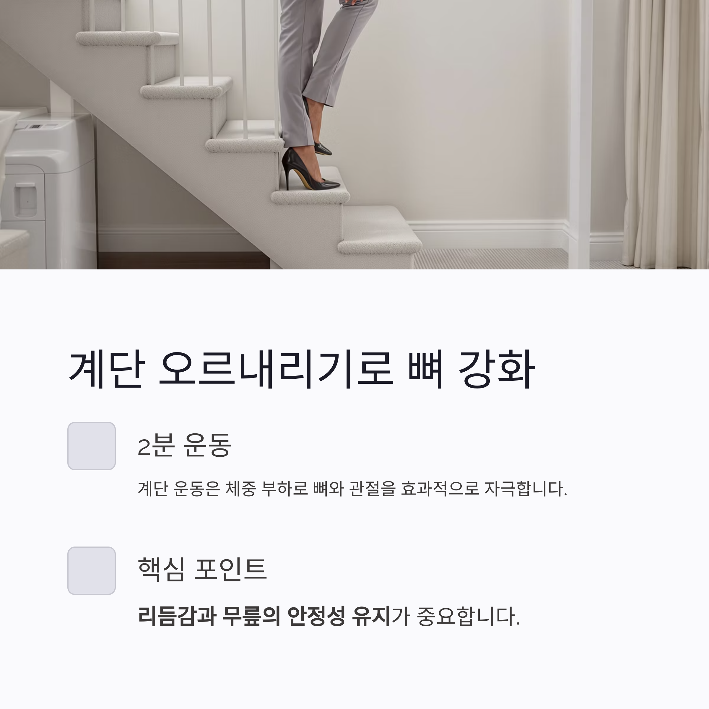 계단 대신 실내 발판 활용이나 발뒤꿈치 들기 위주로 구성하면 됩니다.