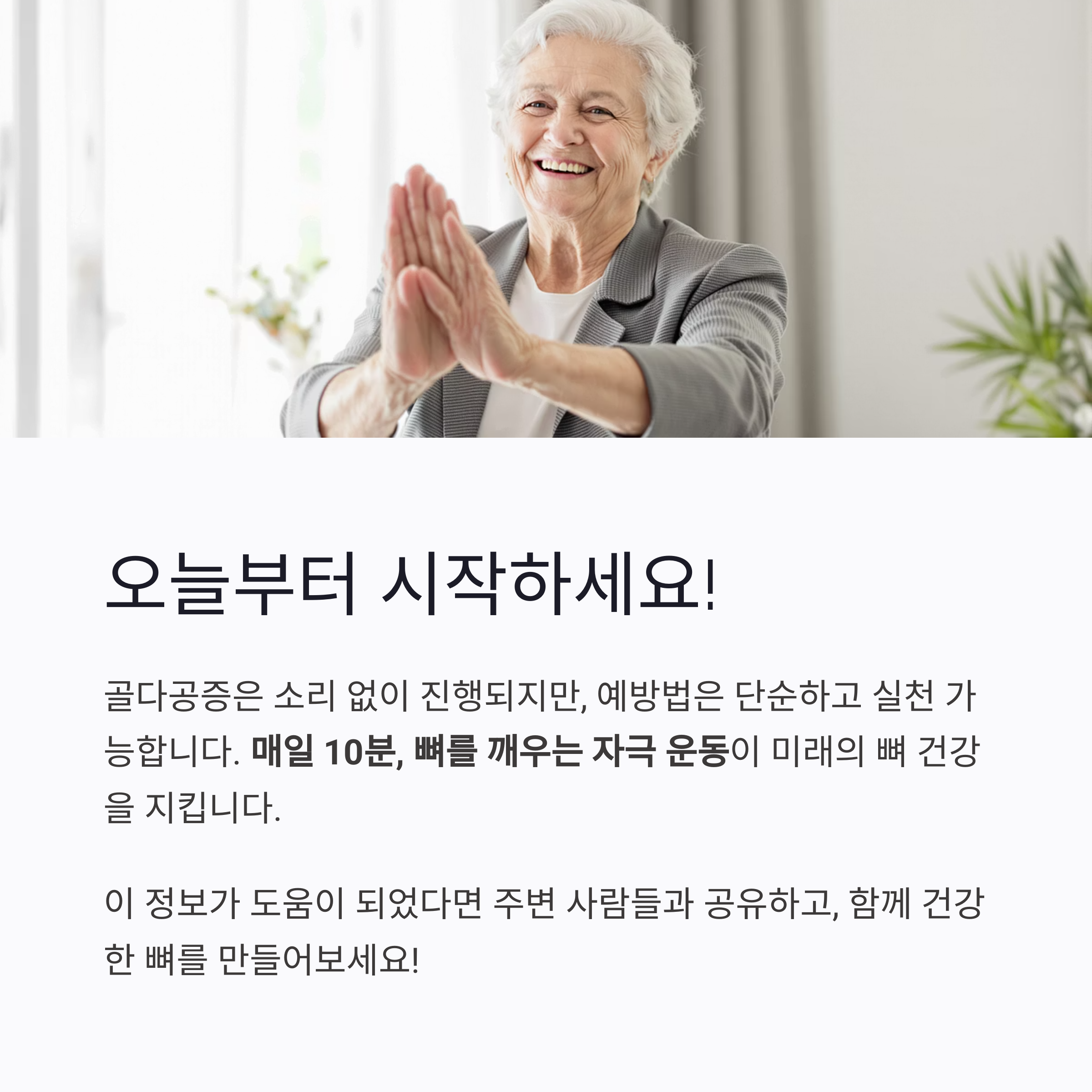 매일 10분, 뼈를 깨우는 자극 운동을 실천하는 것이 곧 미래의 뼈 건강을 지키는 길입니다.