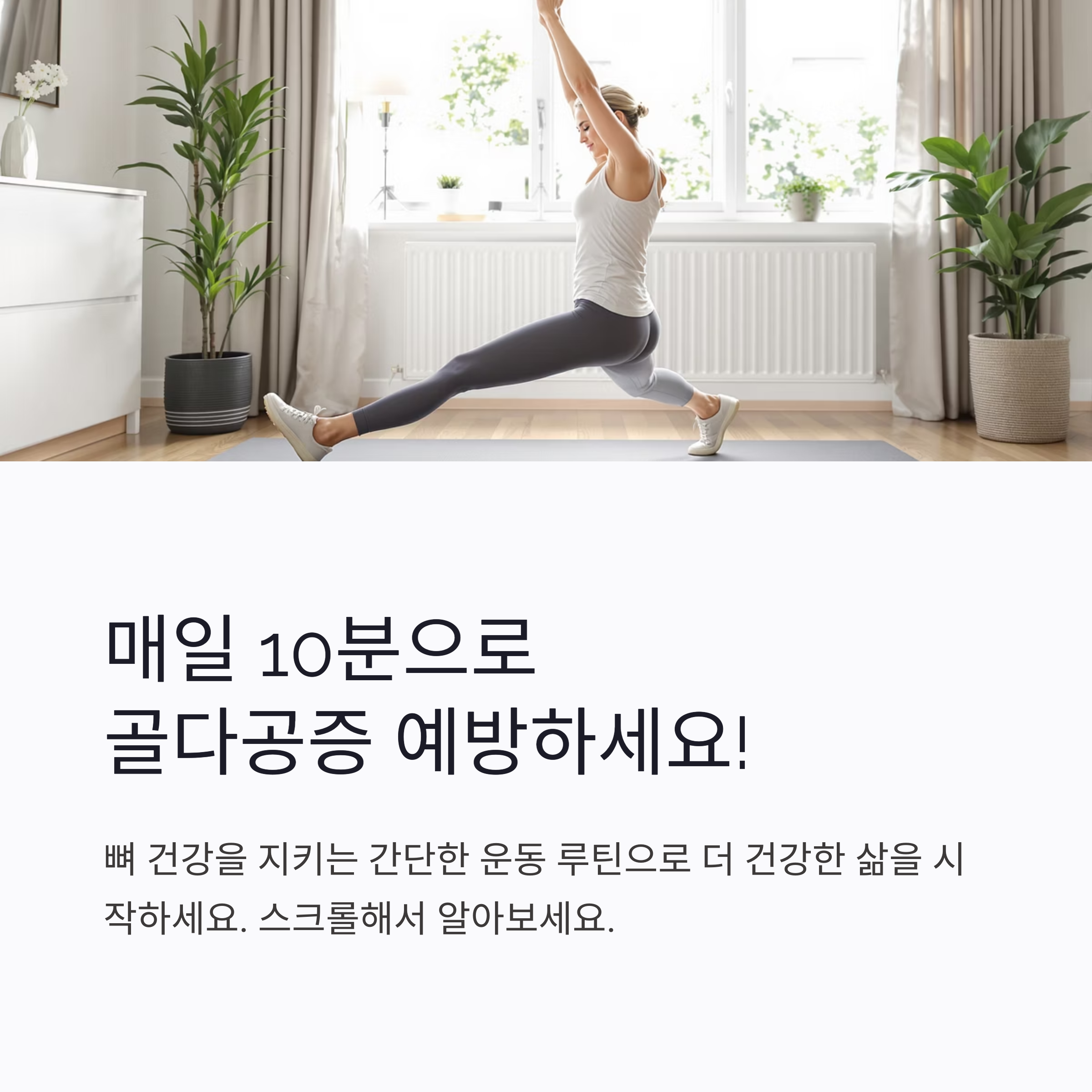 본 글에서는 실내에서 간편하게 따라 할 수 있는 10분 루틴을 구성하여, 뼈 건강을 지키는 실질적인 방법을 소개합니다.