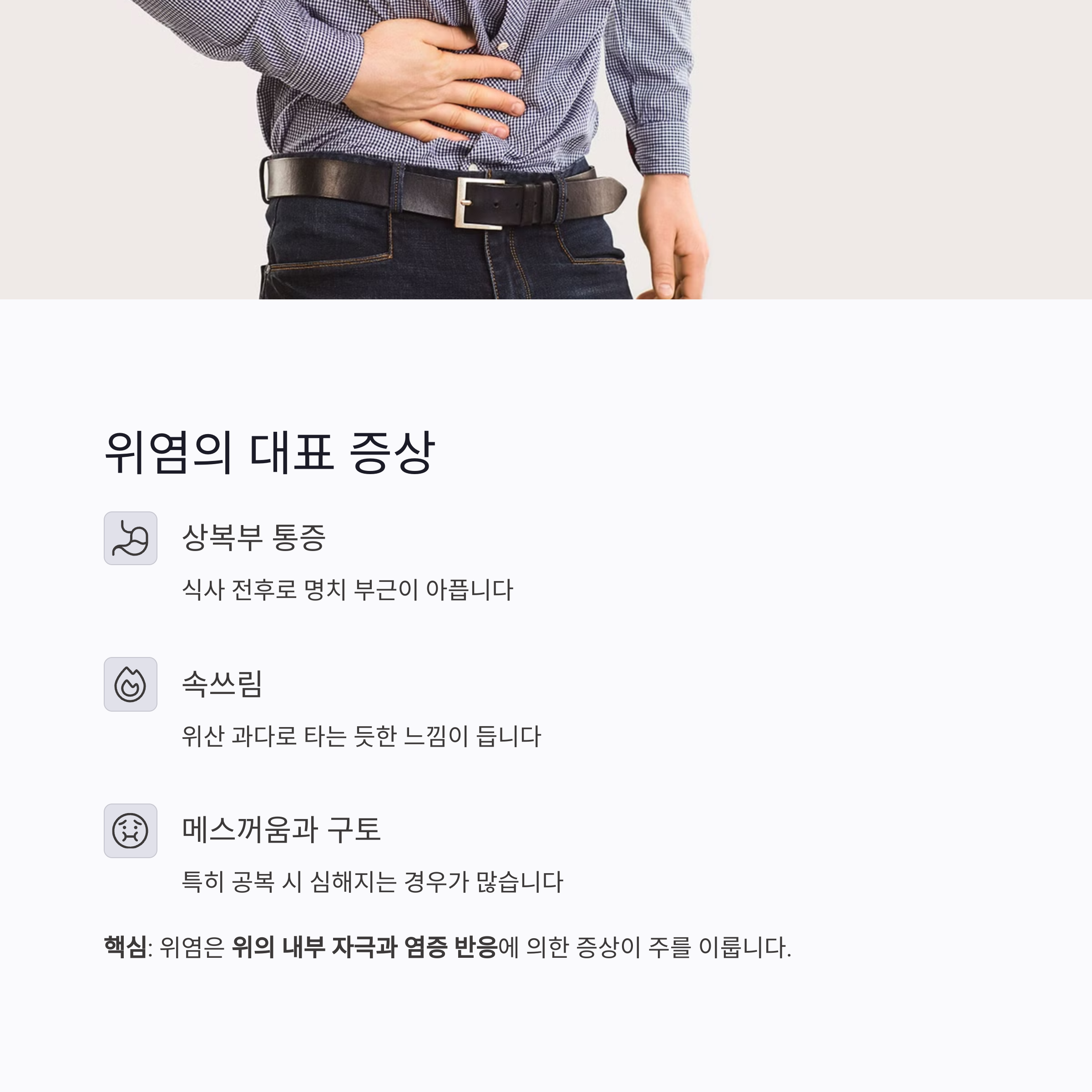 핵심: 위염은 전반적으로 위의 내부 자극과 염증 반응에 의한 증상이 주를 이룹니다.