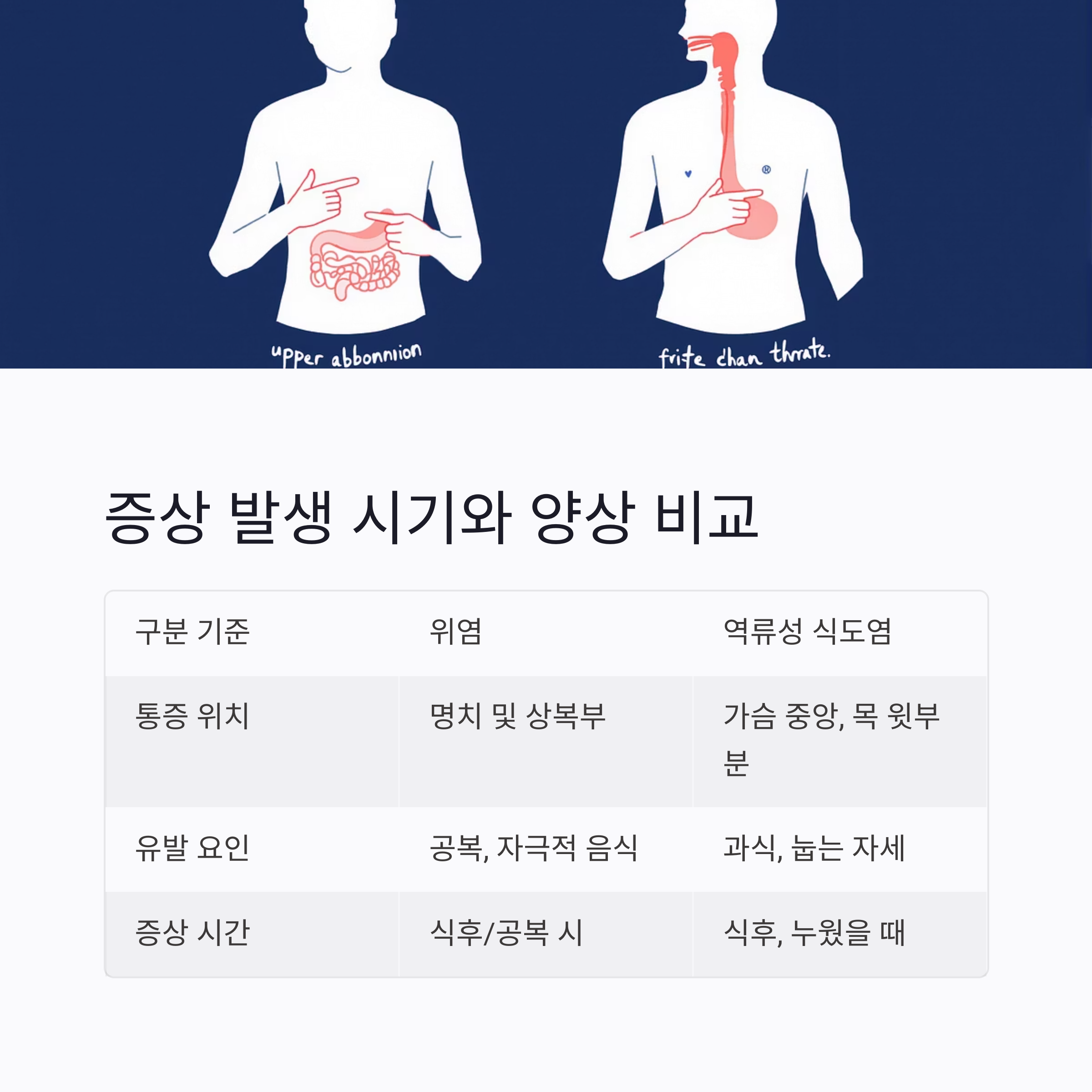 | 통증 위치 | 명치 및 상복부 중심 | 가슴 중앙, 목 윗부분 |