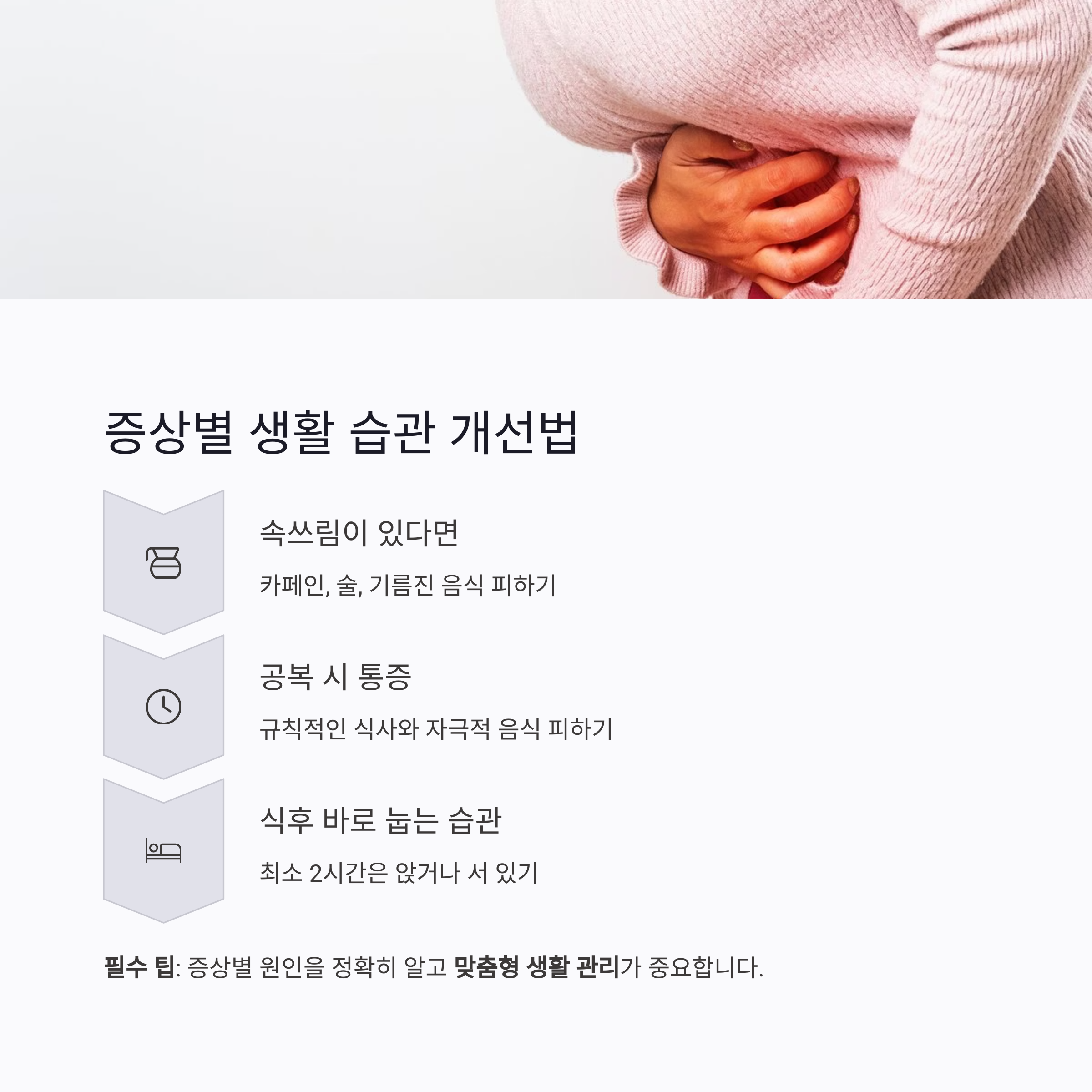 | 공복 시 통증 | 규칙적인 식사와 자극적 음식 피하기 |