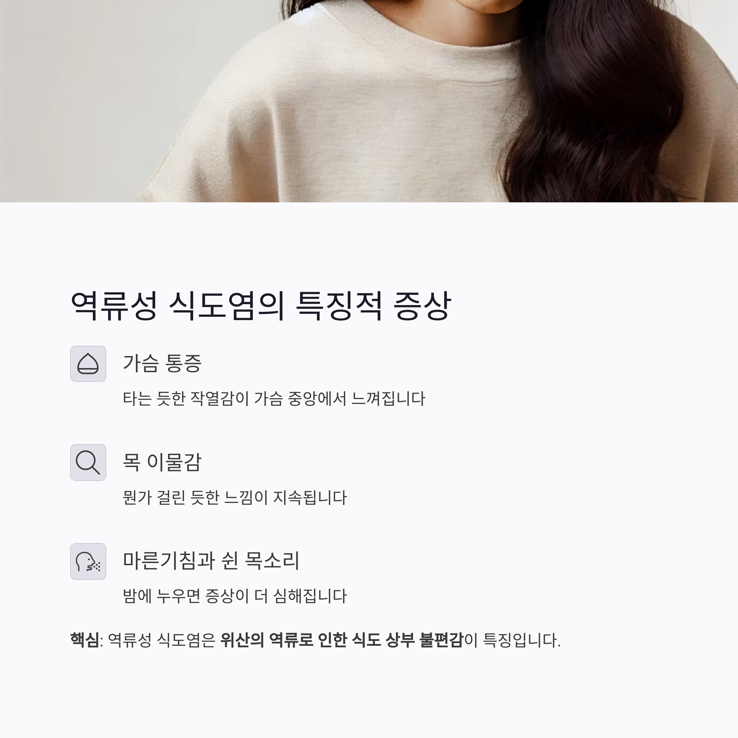 핵심: 역류성 식도염은 위산의 역류로 인한 식도 상부 불편감이 특징입니다.