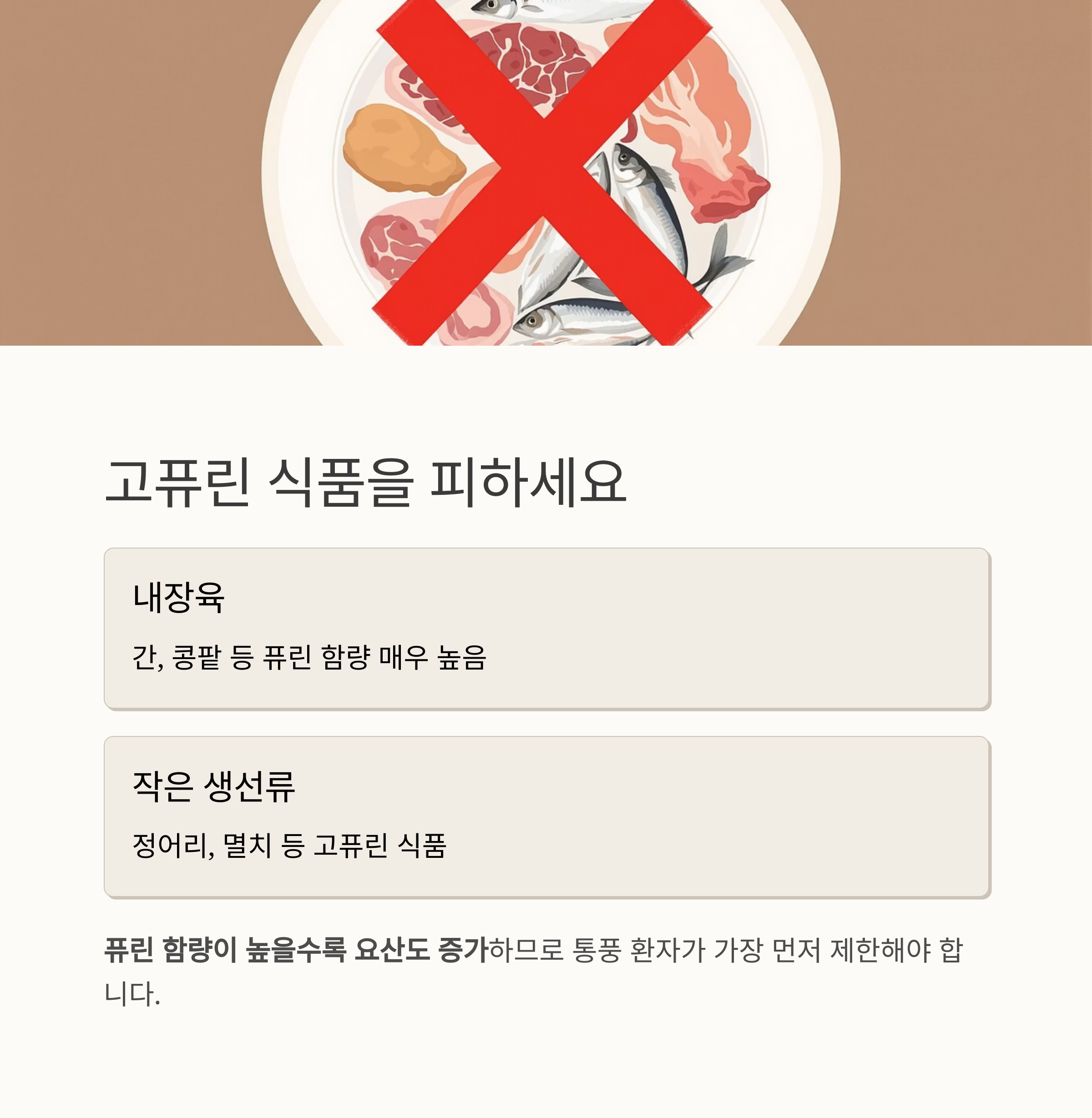| 붉은 고기 | 고지방 + 고퓨린 조합 |