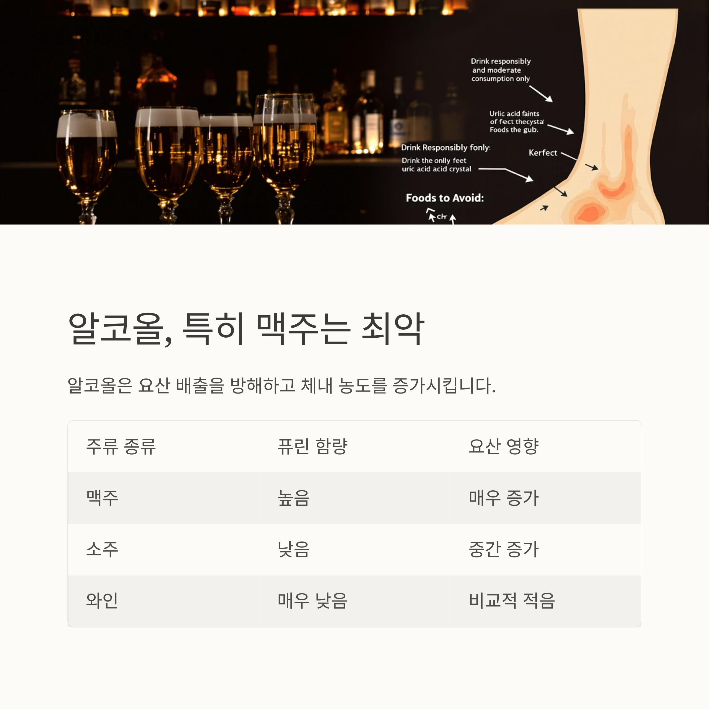 알코올은 요산 배출을 방해하고 체내 농도를 증가시킵니다.