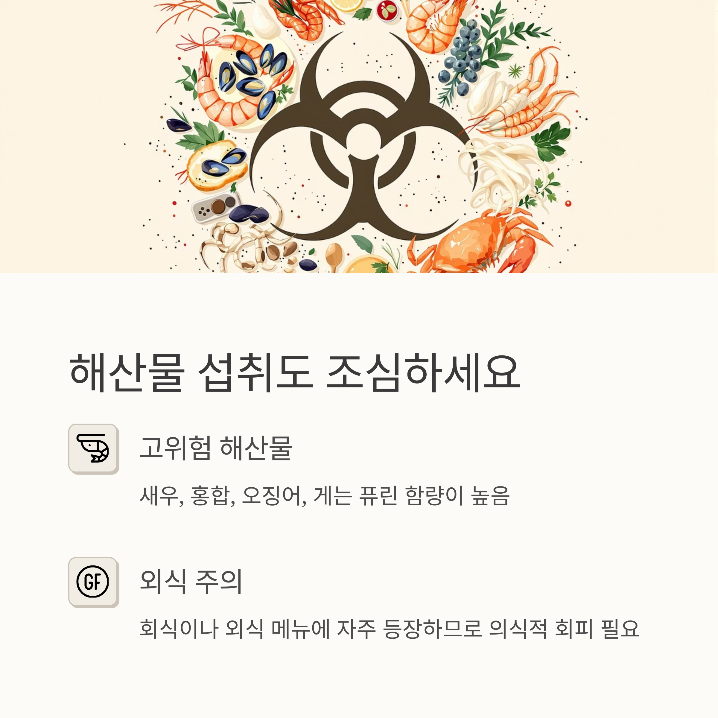 | 해산물 | 퓨린 다량 포함, 염증 유발 |