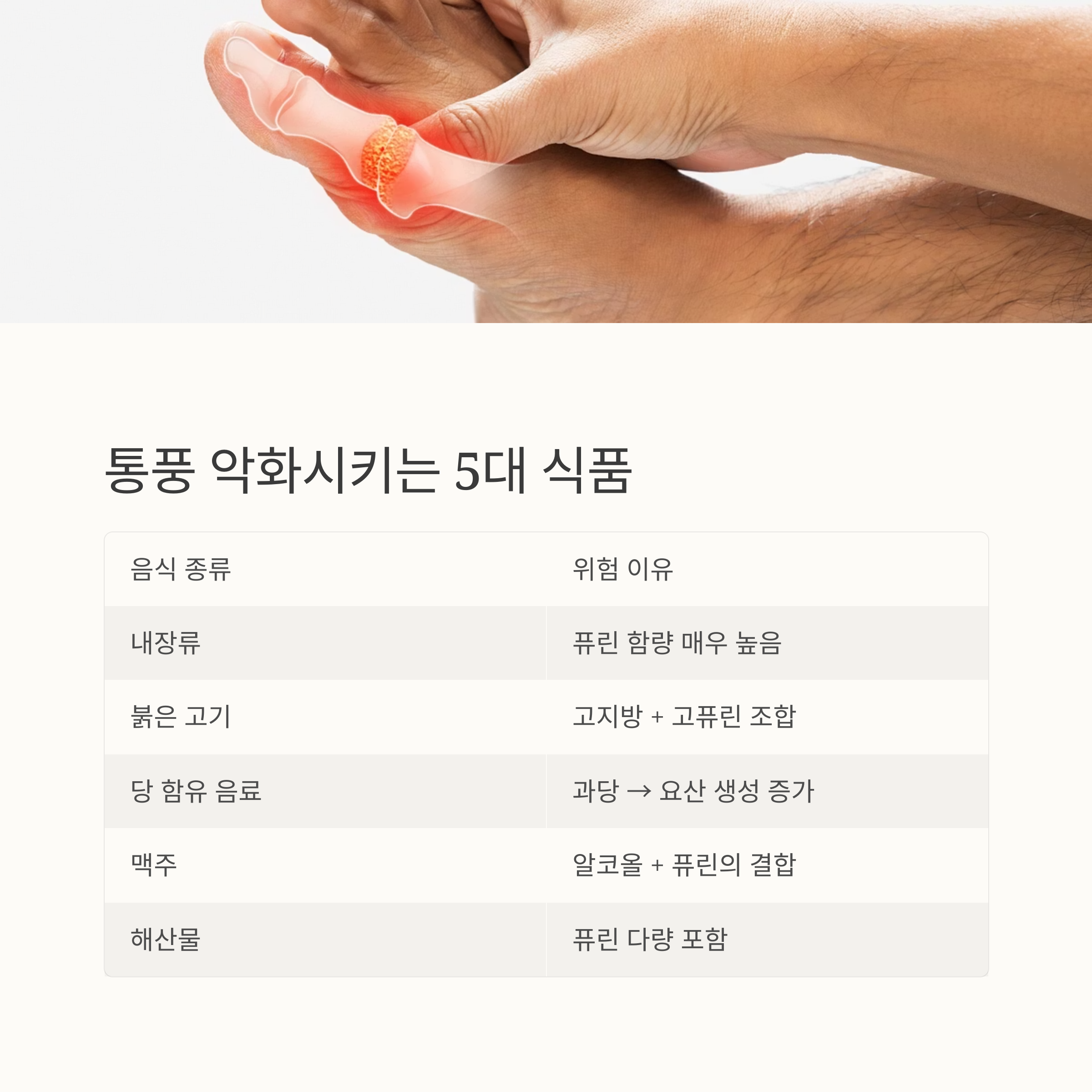 통풍은 요산 수치가 비정상적으로 증가하면서 관절에 통증을 유발하는 대사 질환입니다. 특히 식습관이 큰 영향을 미치기 때문에, 올바른 음식 선택은 통풍 관리에 매우 중요합니다. 이 글에서는 통풍을 악화시킬 수 있는 대표적인 음식 5가지를 소개하고, 피해야 할 이유를 함께 정리해드립니다.