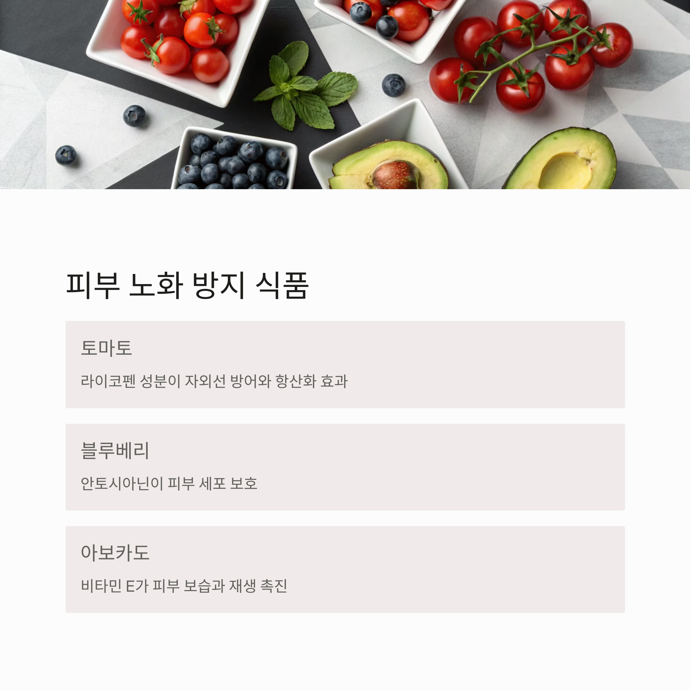 피부 노화 방지에 좋은 음식은 일상 속에서 실천할 수 있는 가장 쉬운 예방법입니다.