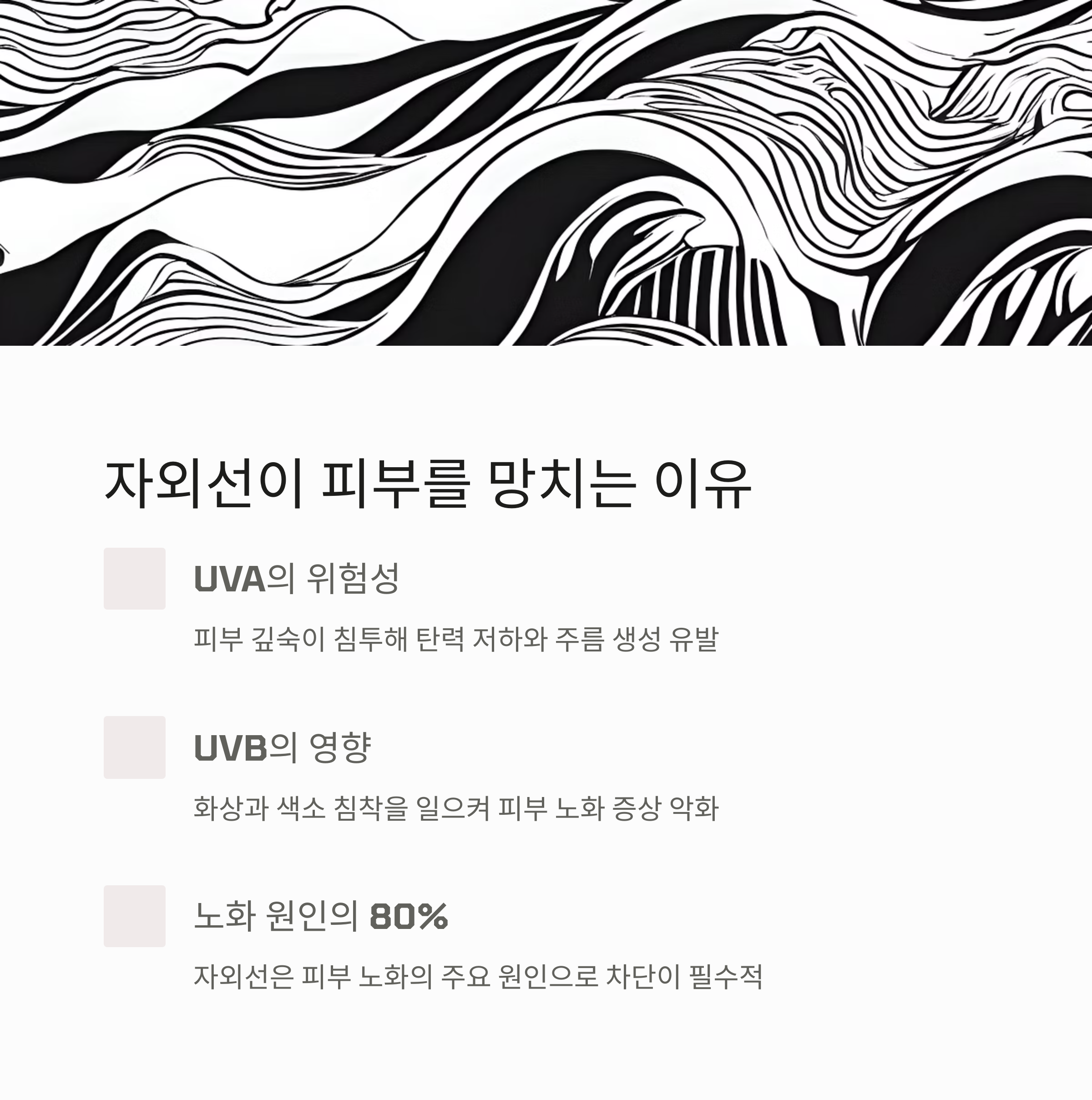 특히 **자외선 A(UVA)**는 피부 깊숙한 곳까지 침투해 피부 탄력 저하와 주름 생성을 유발하며,