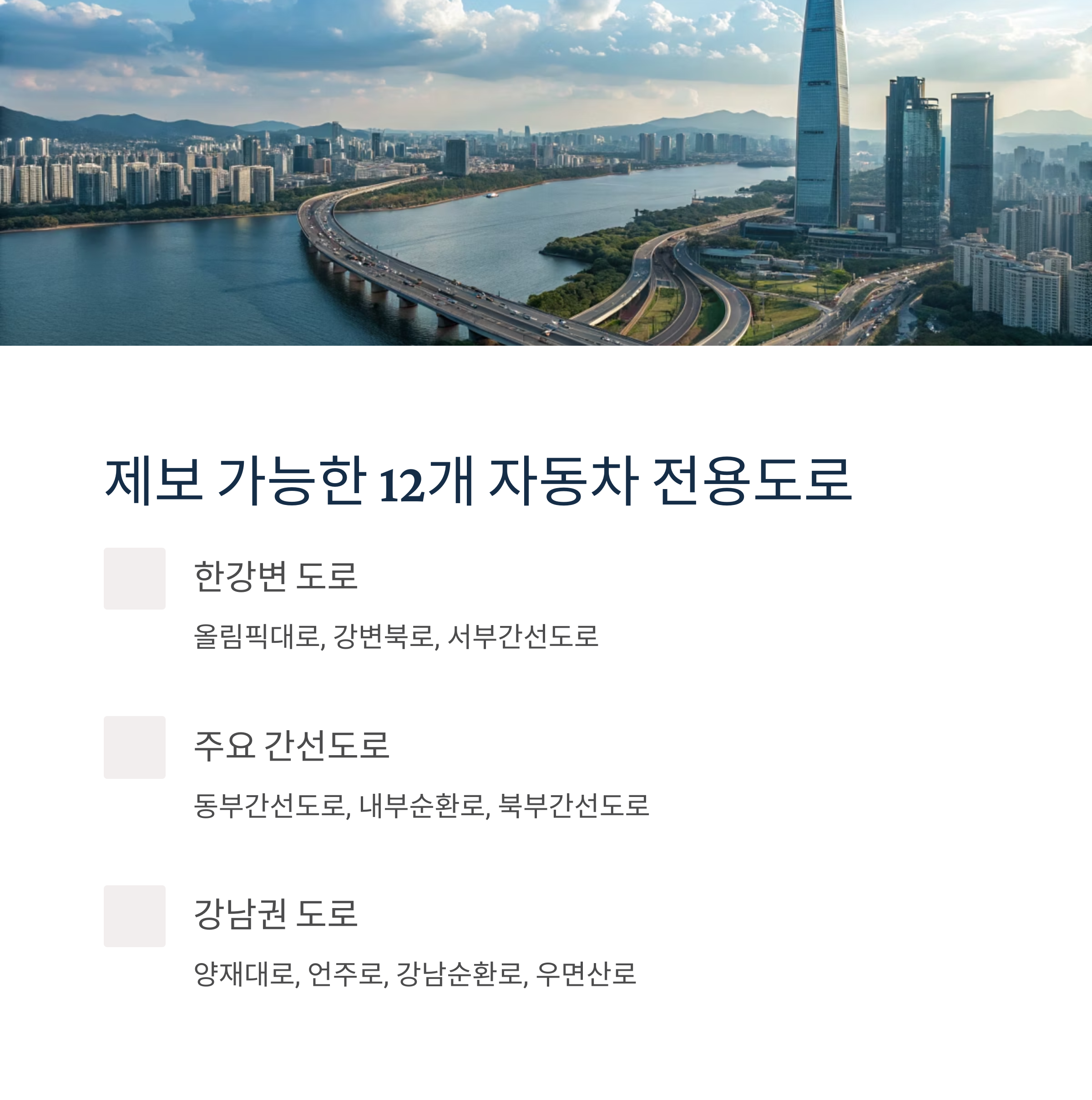 서울시가 지정한 총 12개의 자동차 전용도로에서만 제보 포상이 가능합니다.