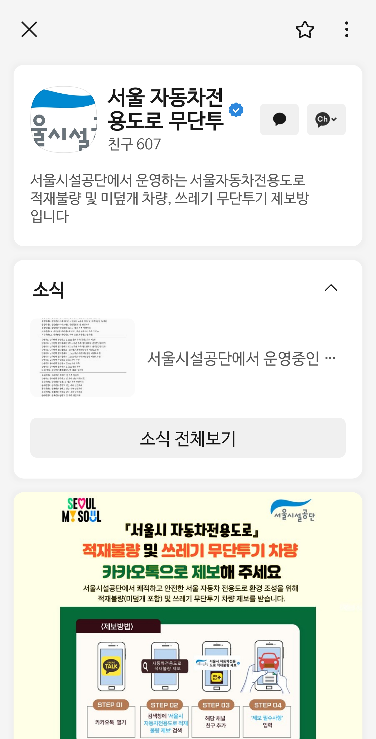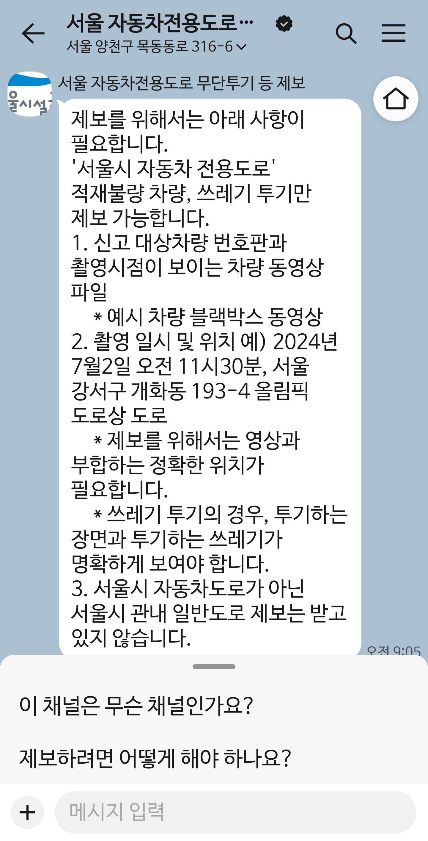 채널명: "서울 자동차전용도로 무단투기 등 제보" - 차량 번호판과 투기 장면이 보이도록 촬영하세요