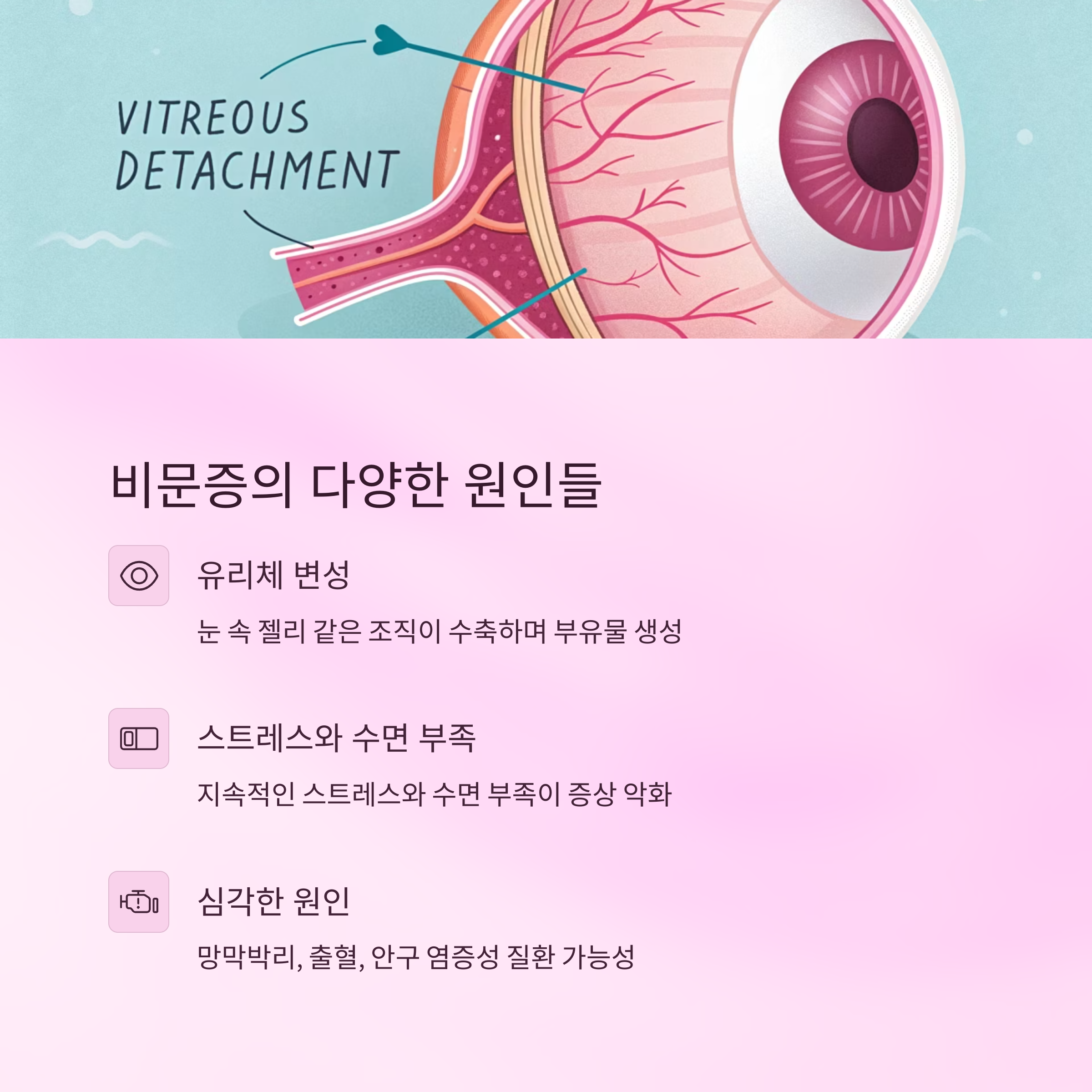 비문증 증상은 나이, 수면 부족, 생활 습관 등 복합적인 원인으로 발생합니다.