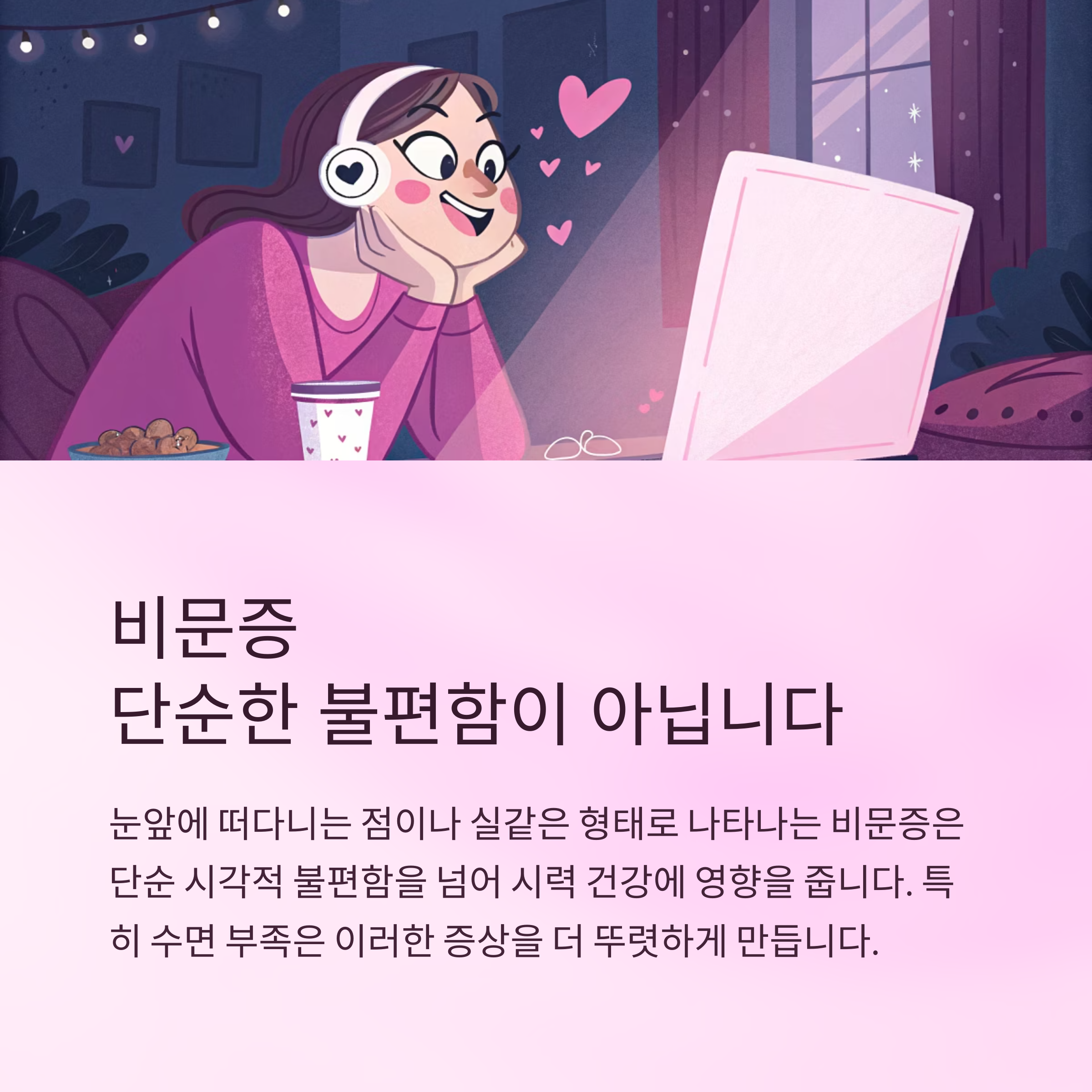 비문증 증상은 눈앞에 떠다니는 점이나 실같은 형태로 나타나며, 단순한 시각적 불편을 넘어서 시력 건강에 영향을 줄 수 있습니다. 특히 수면 부족은 이러한 증상을 더 자주, 더 뚜렷하게 느끼게 만들 수 있습니다.