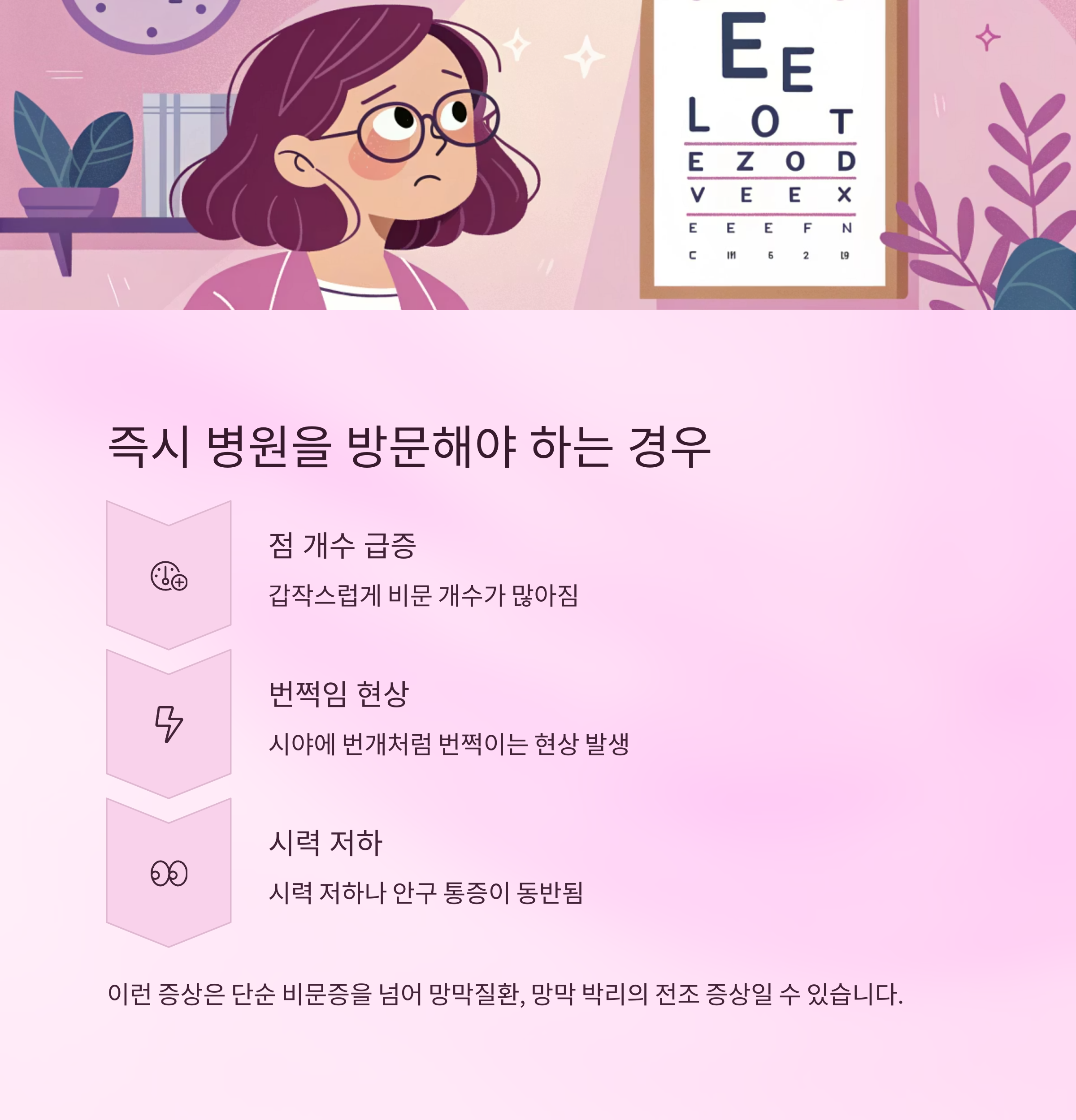 핵심: 이상을 느끼면 기다리지 말고 조기에 검사받는 것이 가장 효과적인 비문증 치료입니다.