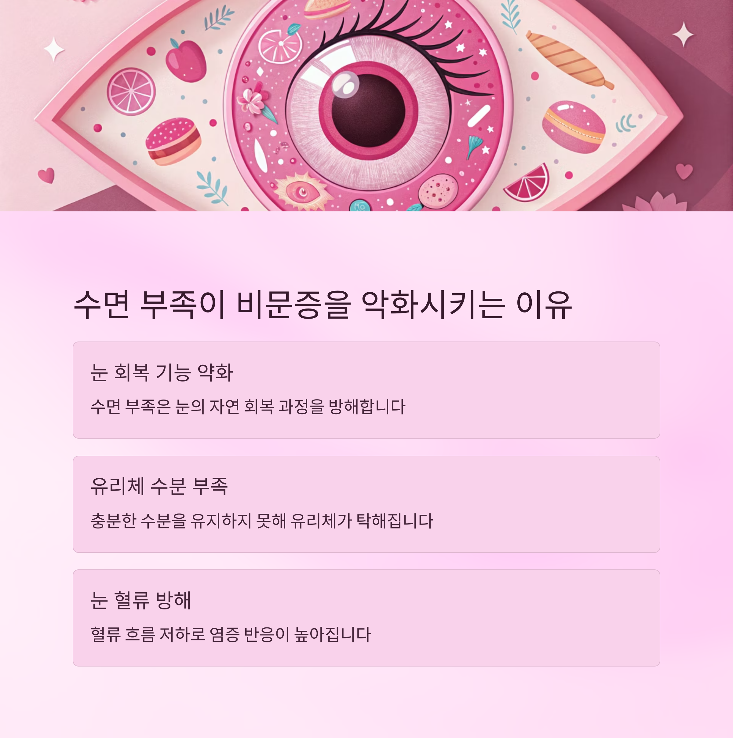 그 이유는 수면 부족이 눈의 회복 기능을 약화시키기 때문입니다.