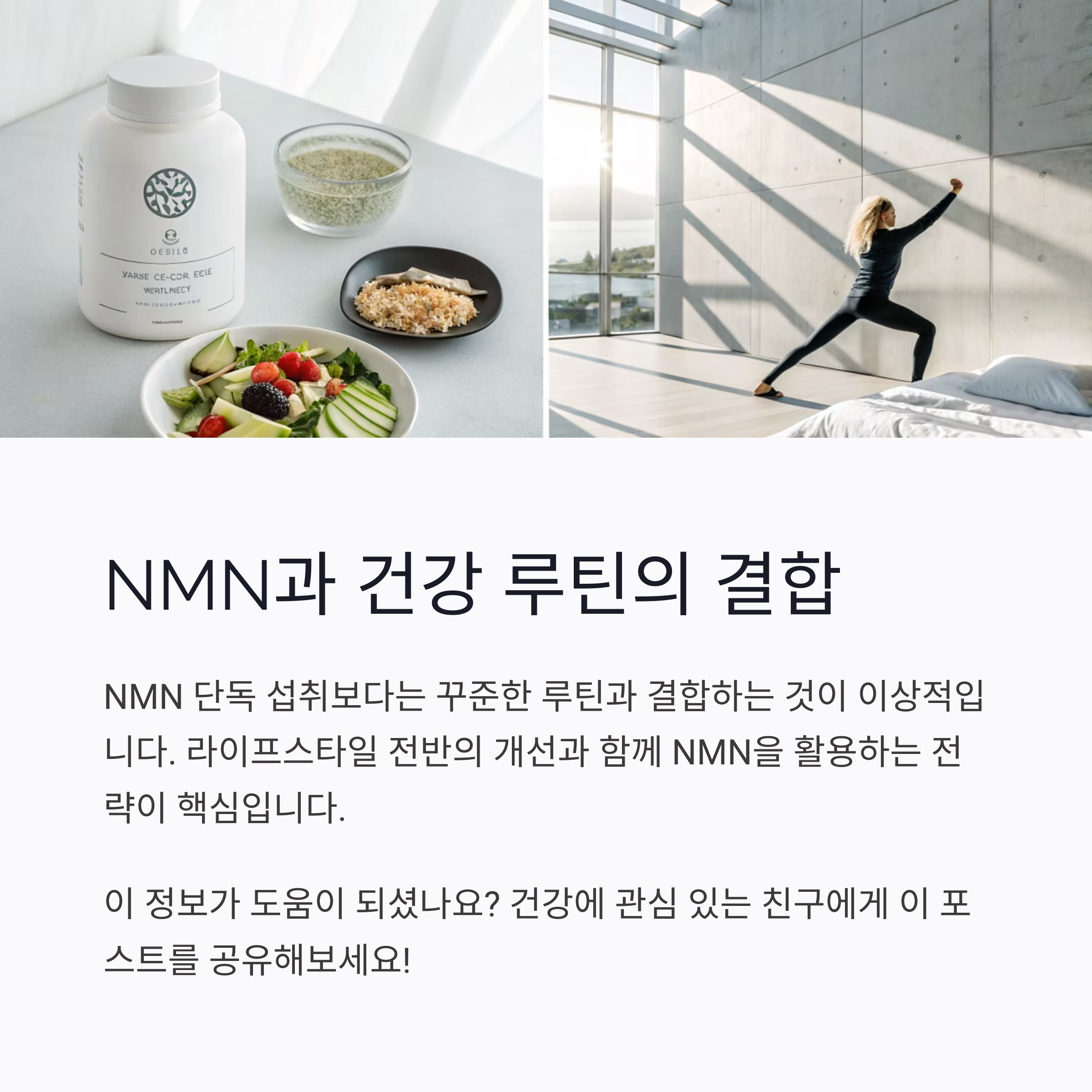 NMN 단독 섭취보다는 꾸준한 루틴과 결합하는 것이 이상적입니다.