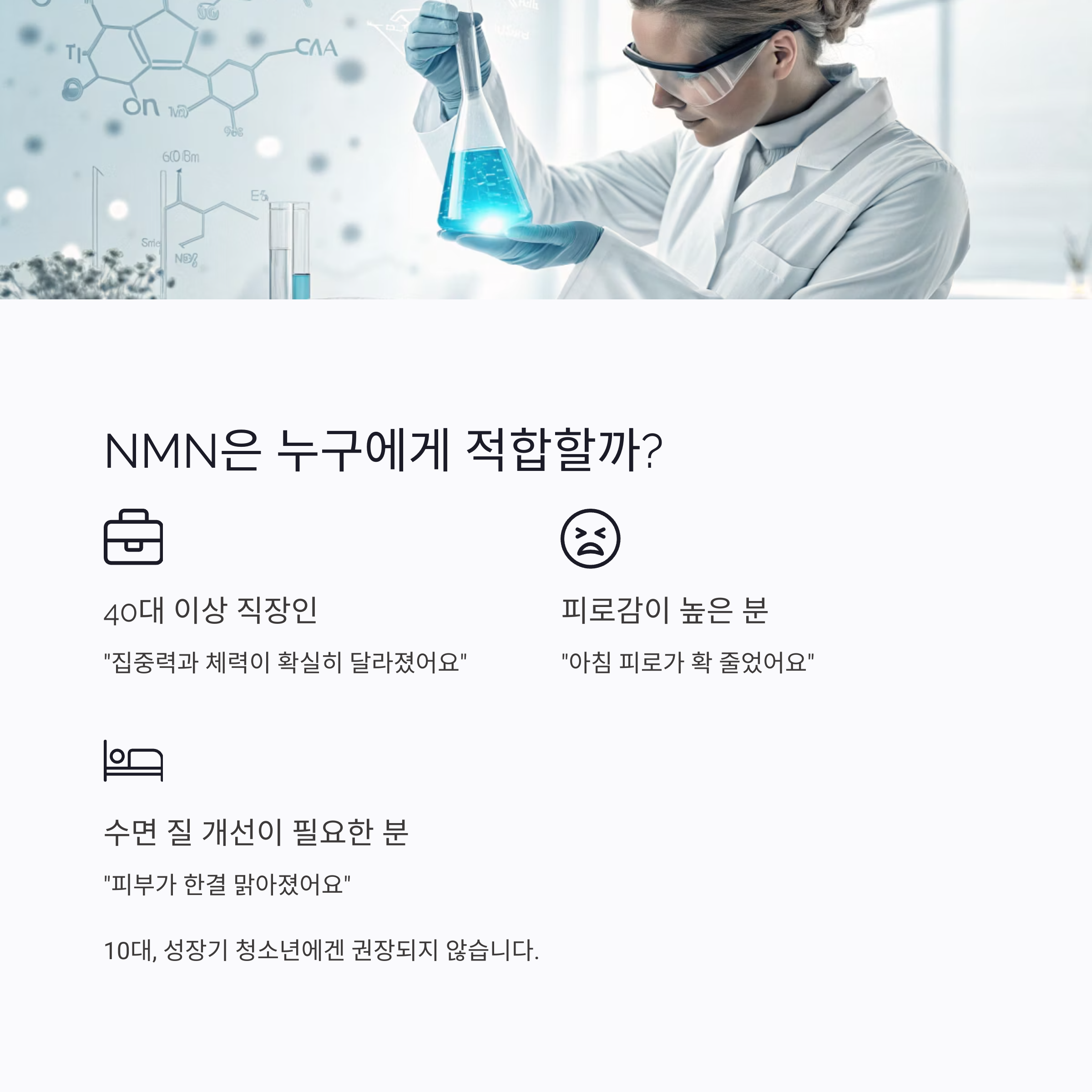 이처럼 NMN은 40대 이상 직장인, 피로감이 높은 분, 수면 질 개선이 필요한 분에게 적합합니다.