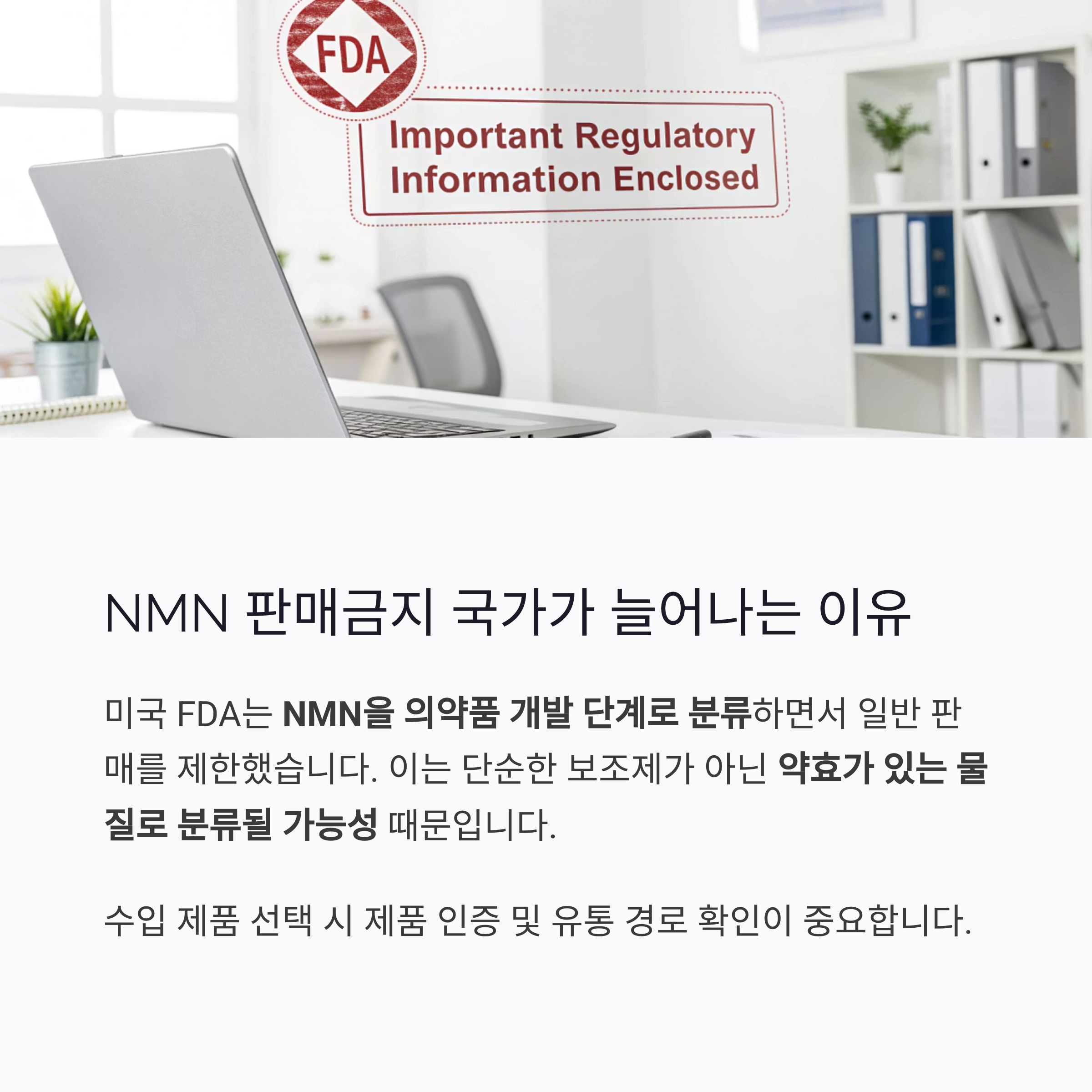 대표적으로 미국 FDA는 NMN을 의약품 개발 단계로 분류하면서 일반 판매를 제한했습니다.