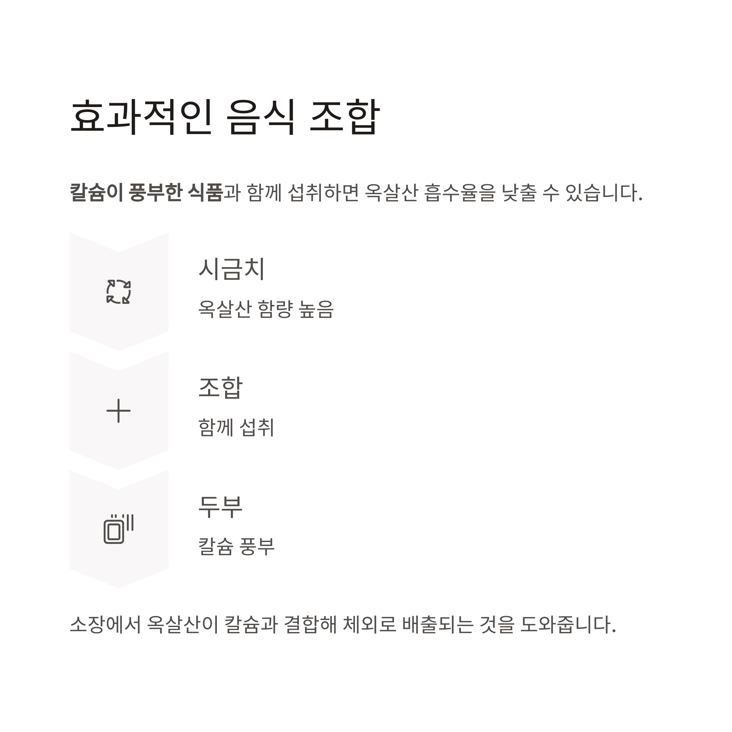 | 칼슘 식품 | 두부, 요거트 | 옥살산과 결합해 체외 배출 유도 |