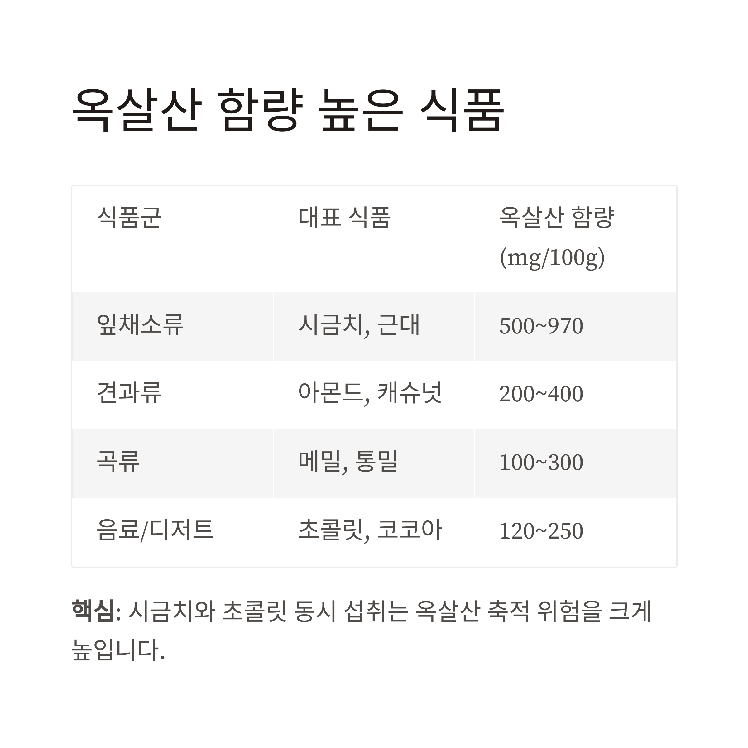 핵심: 시금치와 초콜릿을 동시에 섭취하는 것은 옥살산 축적 위험을 크게 높이는 조합입니다.