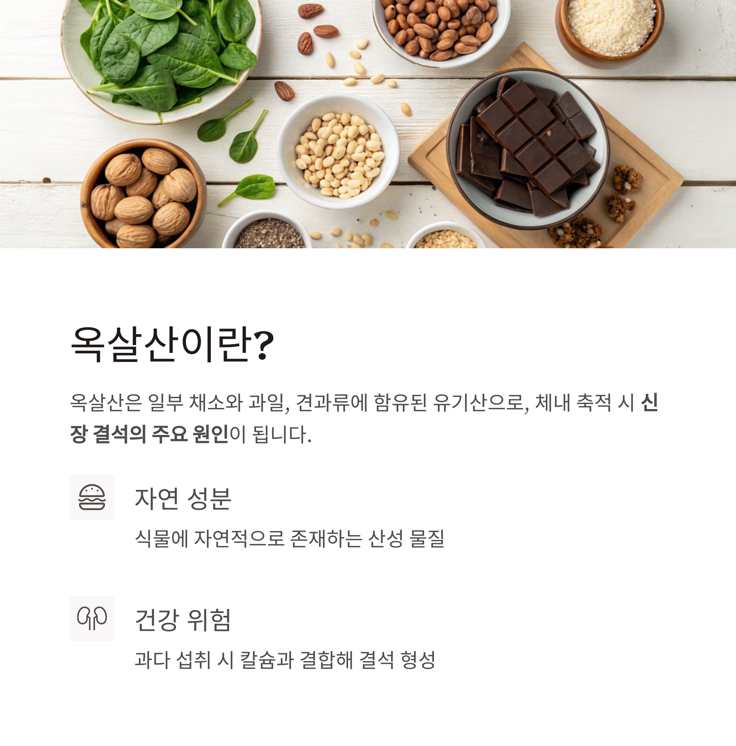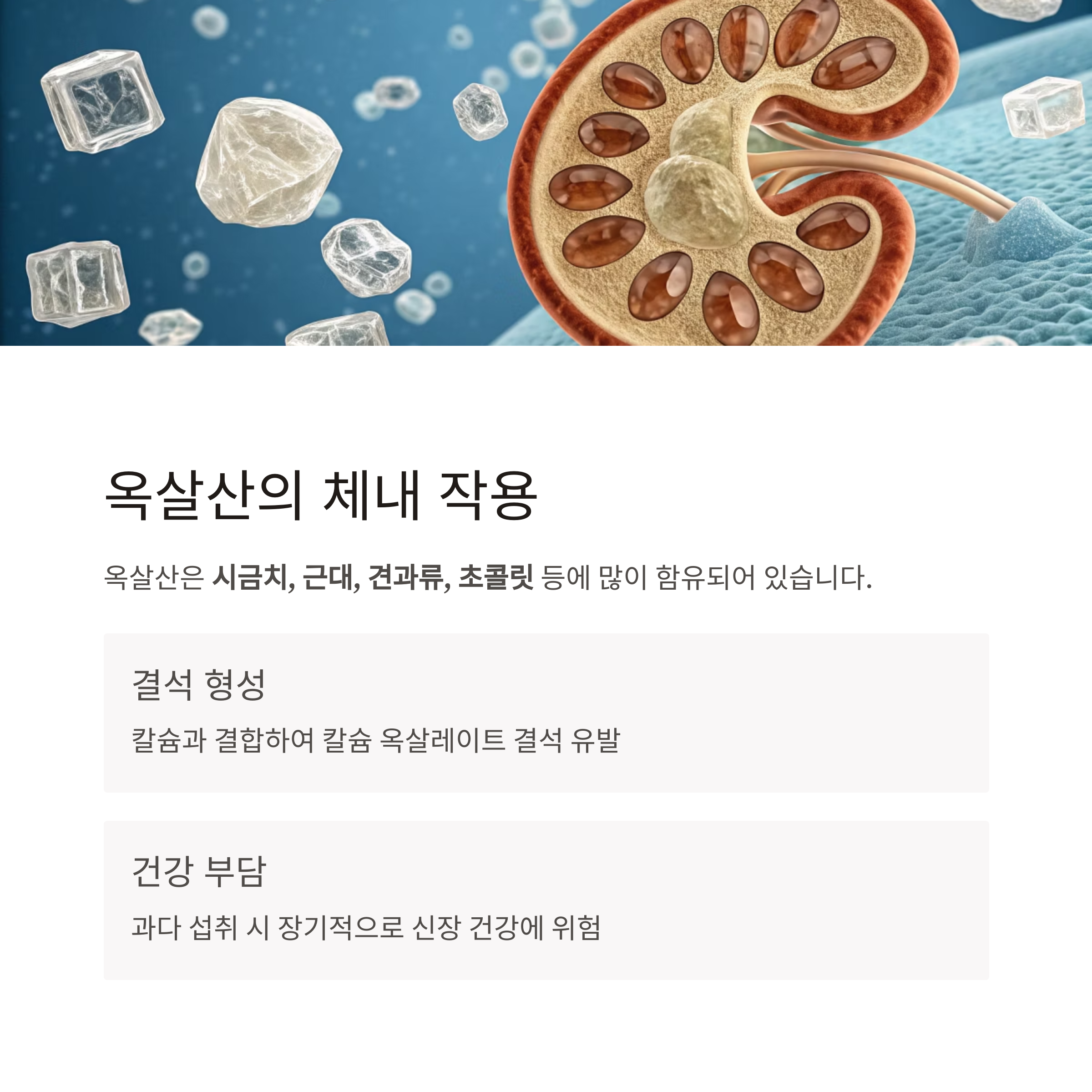 몸에 축적되면 신장 결석의 주요 원인이 될 수 있어 주의가 필요합니다.