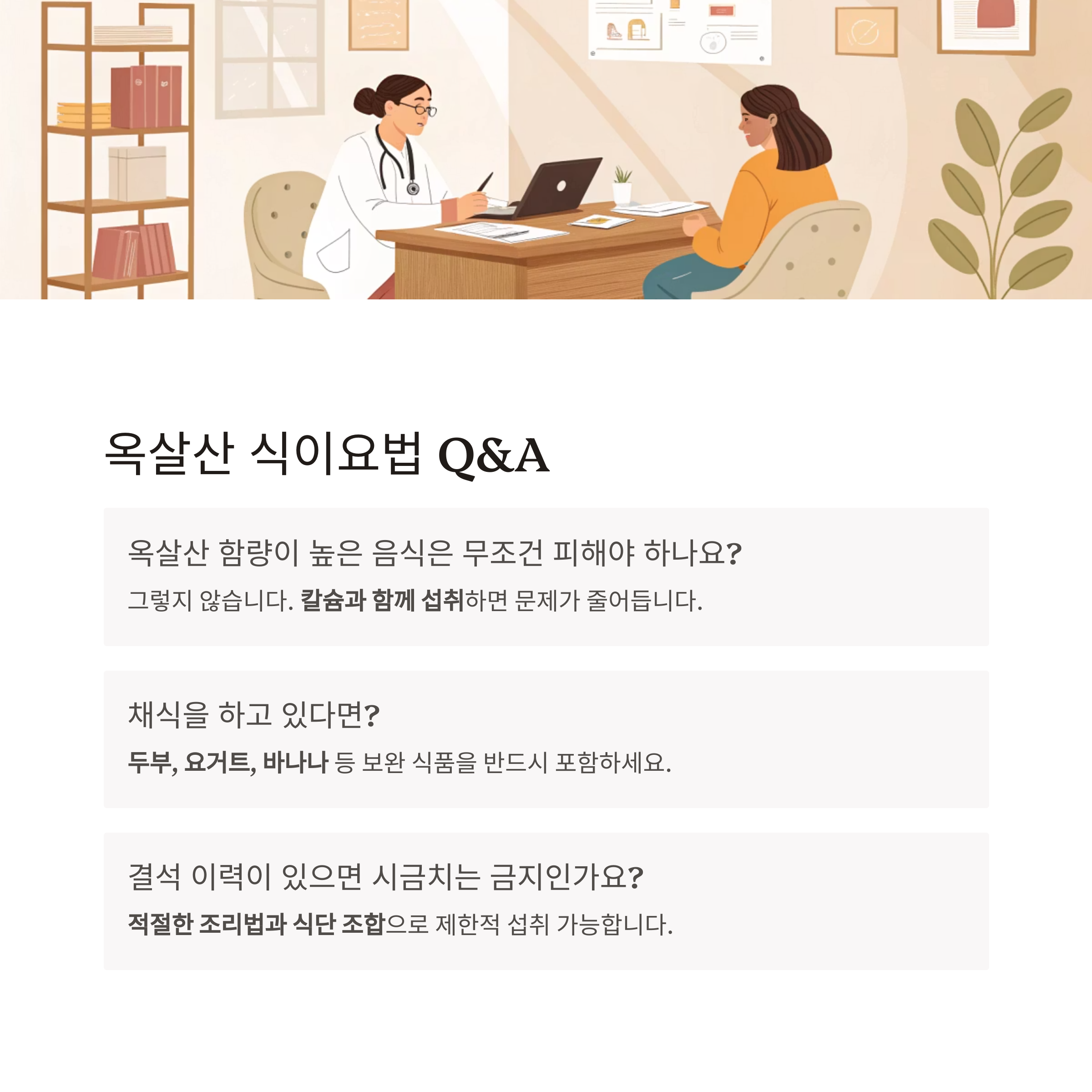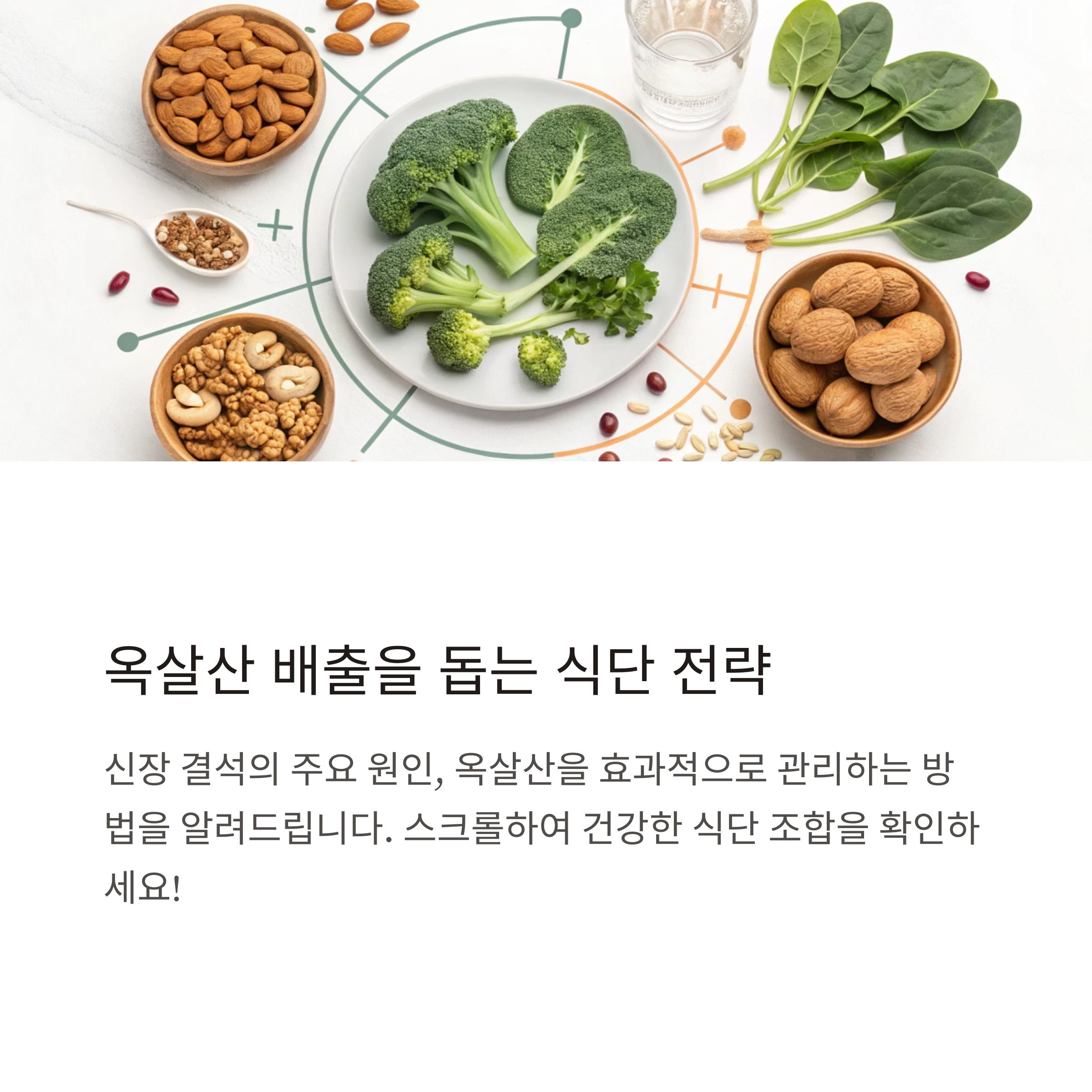 또한 옥살산 배출을 돕는 식단 전략을 제시하여 건강한 식생활 실천에 도움을 드립니다.