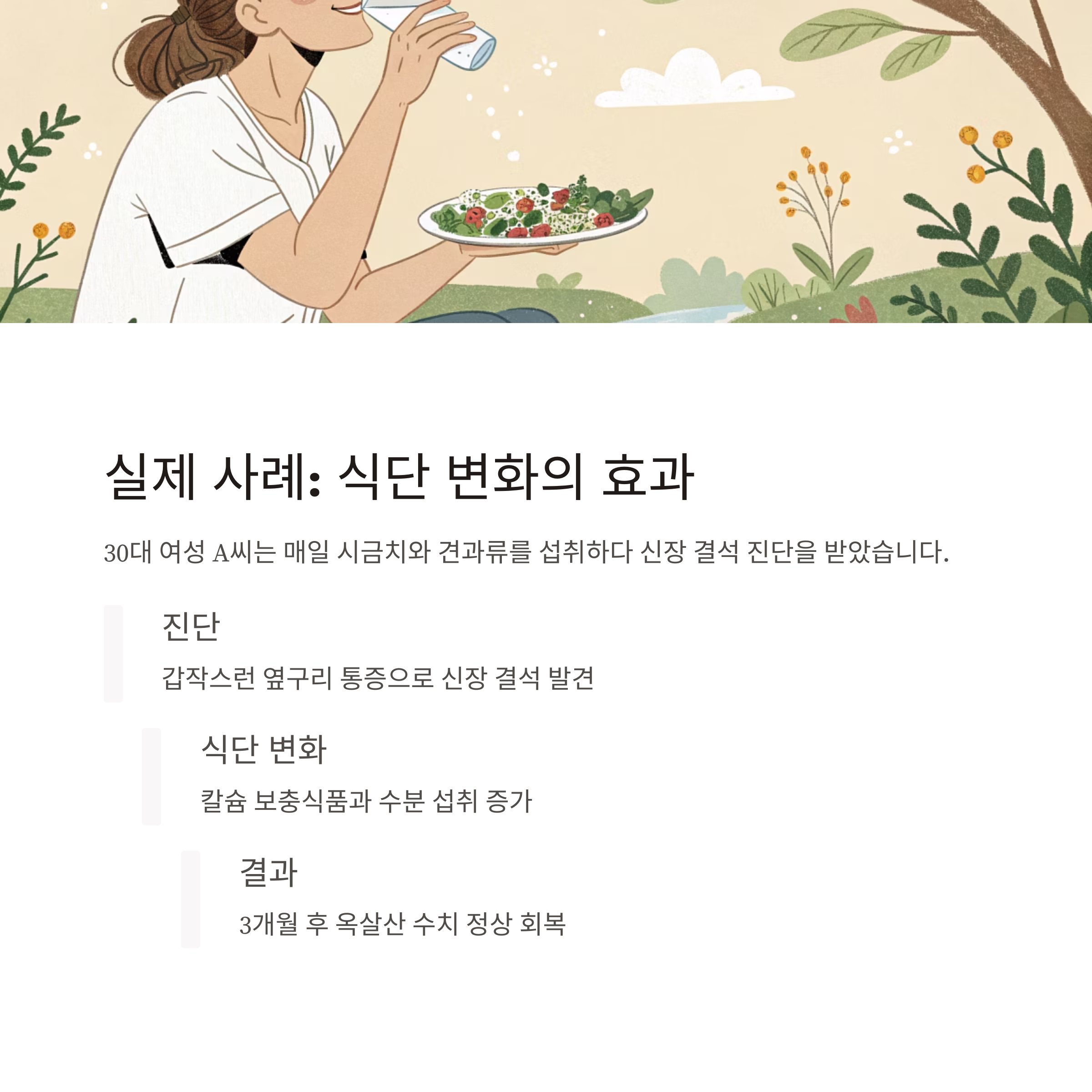 | 수분 많은 식품 | 오이, 수박 | 소변량 증가로 옥살산 희석 효과 유도 |