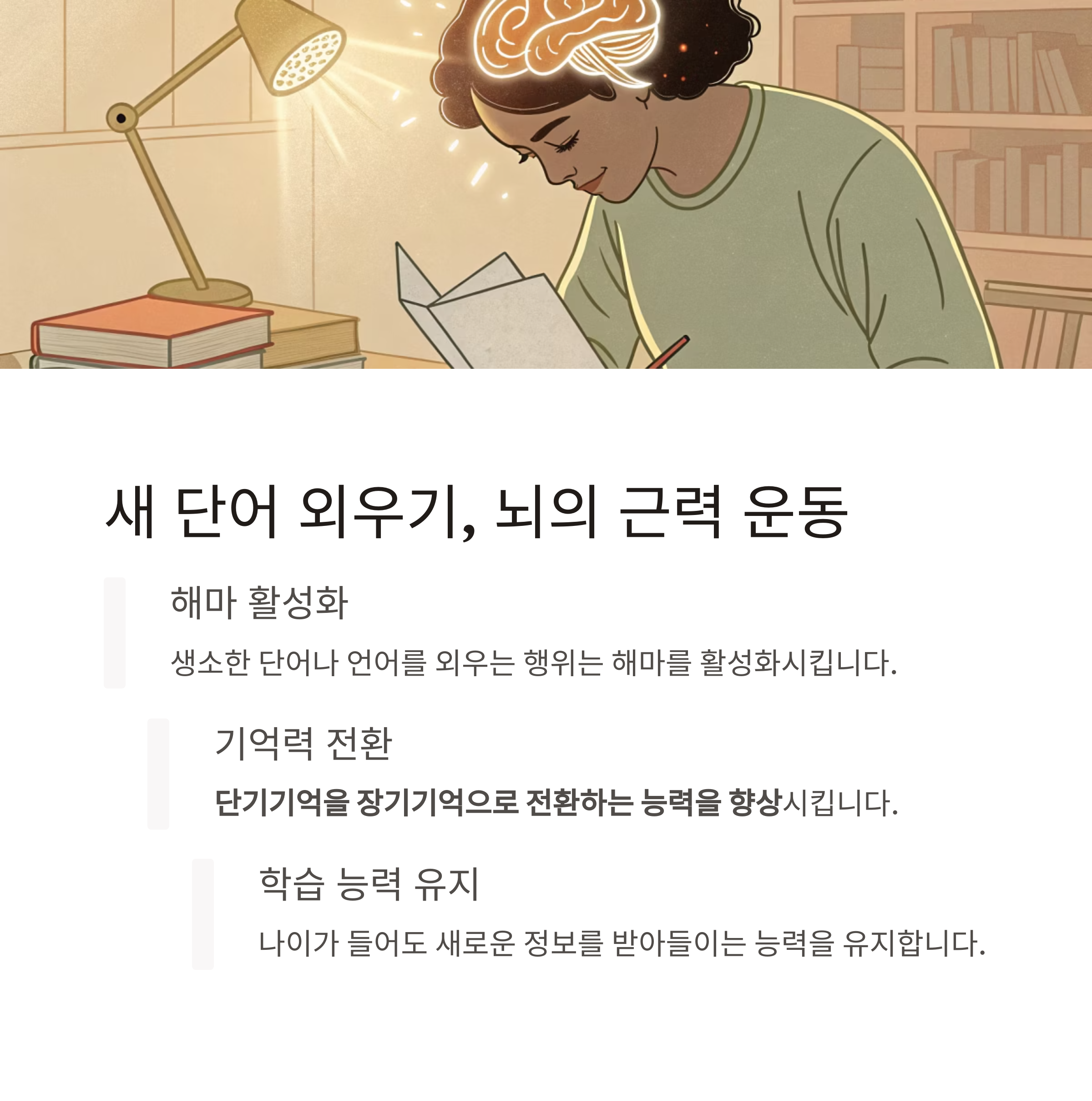 매일 생소한 단어나 언어를 외우는 행위는 해마를 활성화시키는 훈련입니다.