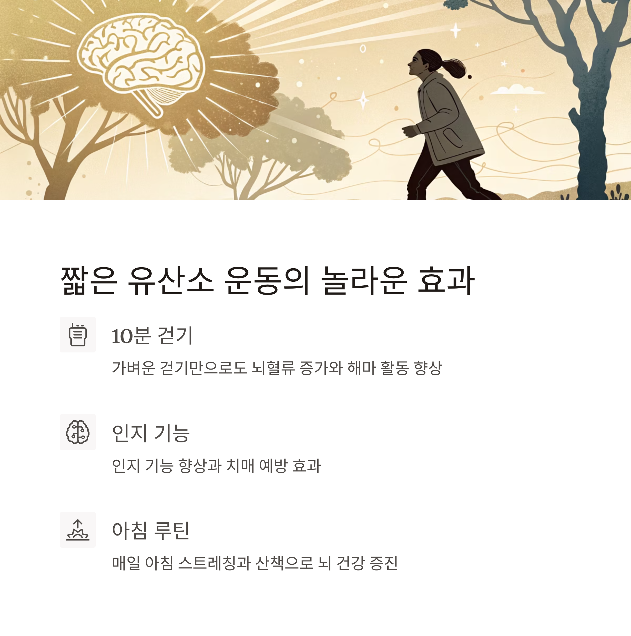 매일 아침 가벼운 스트레칭과 산책을 함께 하는 루틴은 뇌 건강에 큰 힘이 됩니다.
