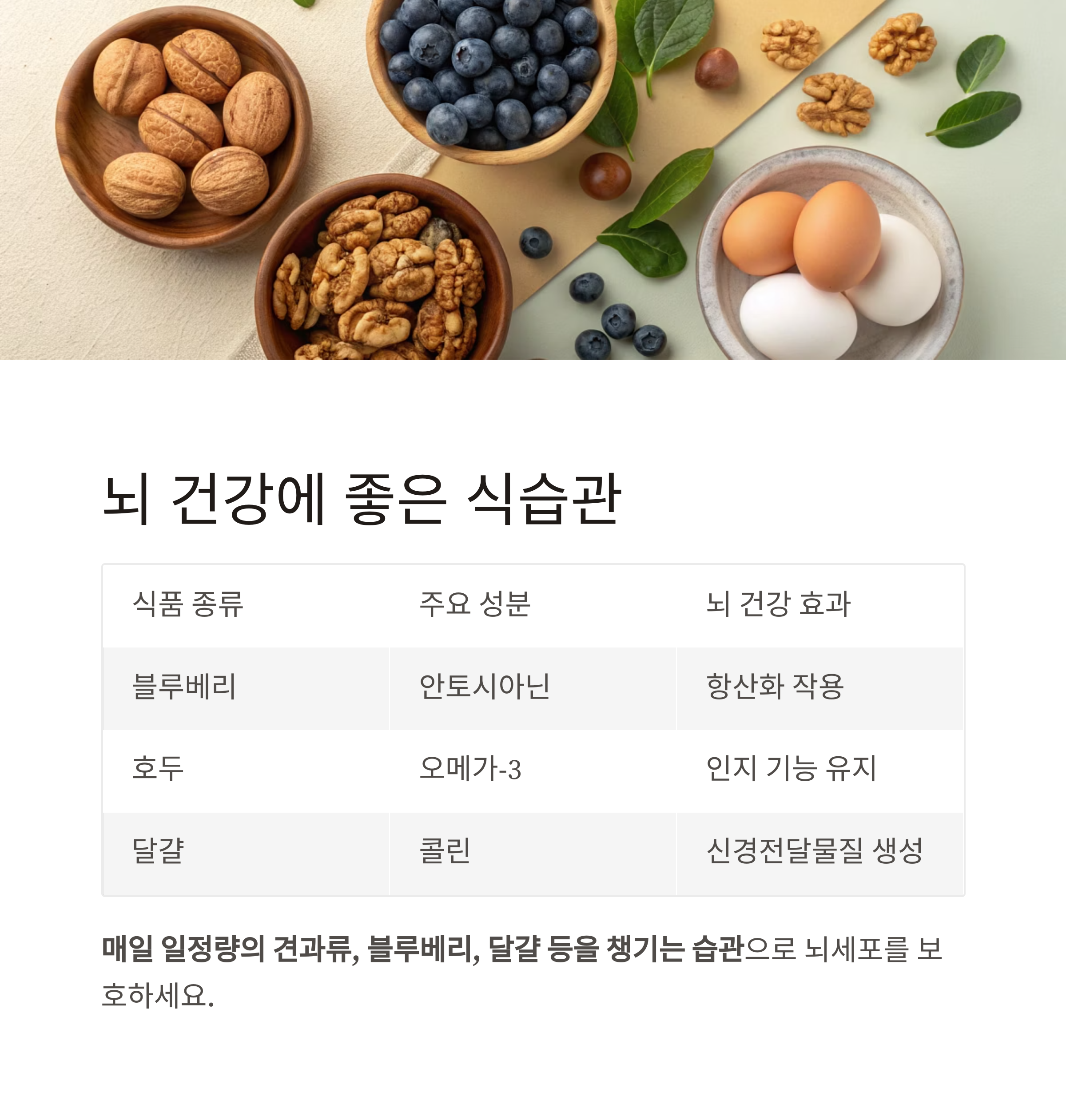 매일 일정량의 견과류, 블루베리, 달걀 등을 챙기는 습관은 뇌 건강에 효과적입니다.