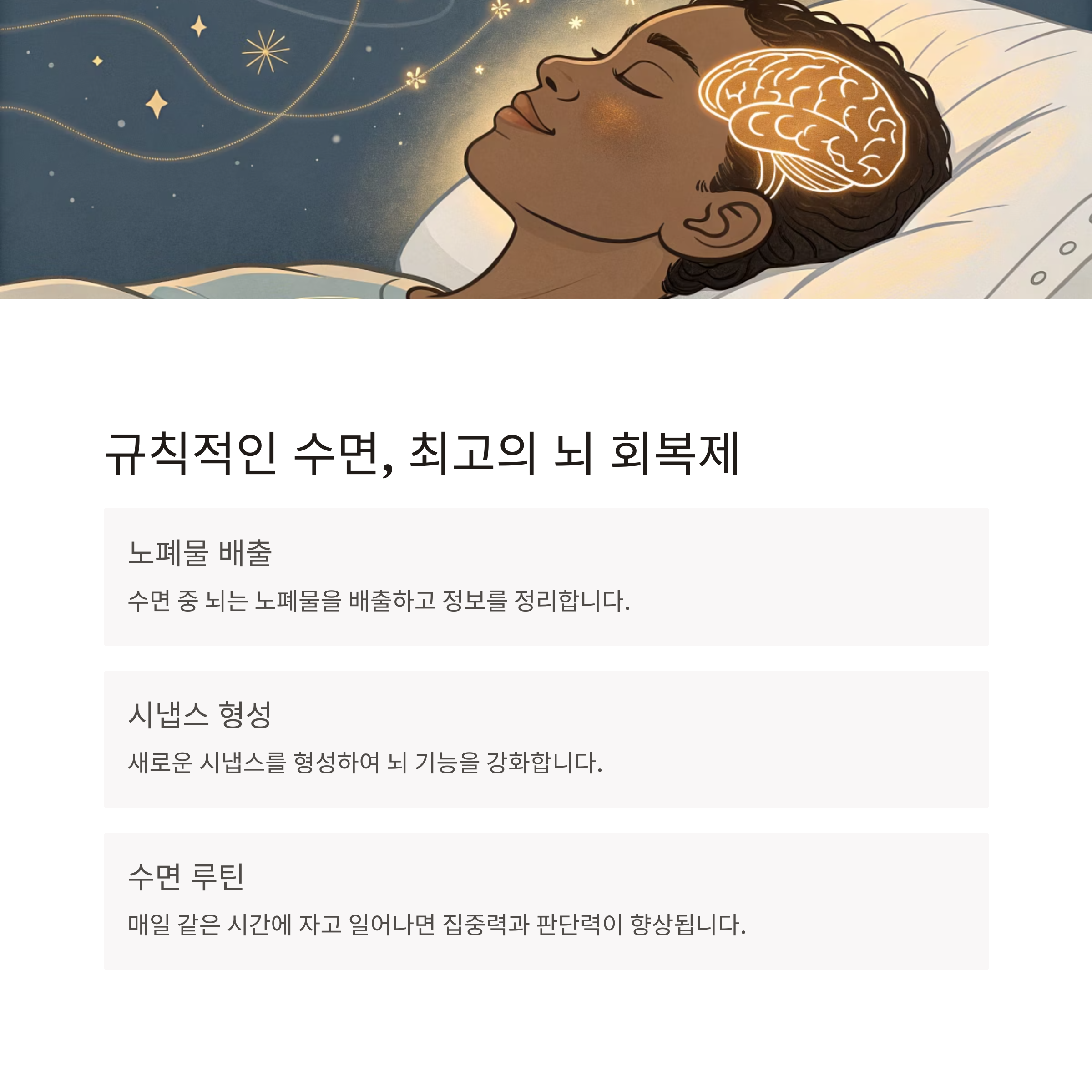 "잠이 보약이다"라는 말처럼 충분하고 규칙적인 수면은 뇌 기능 유지에 필수입니다.