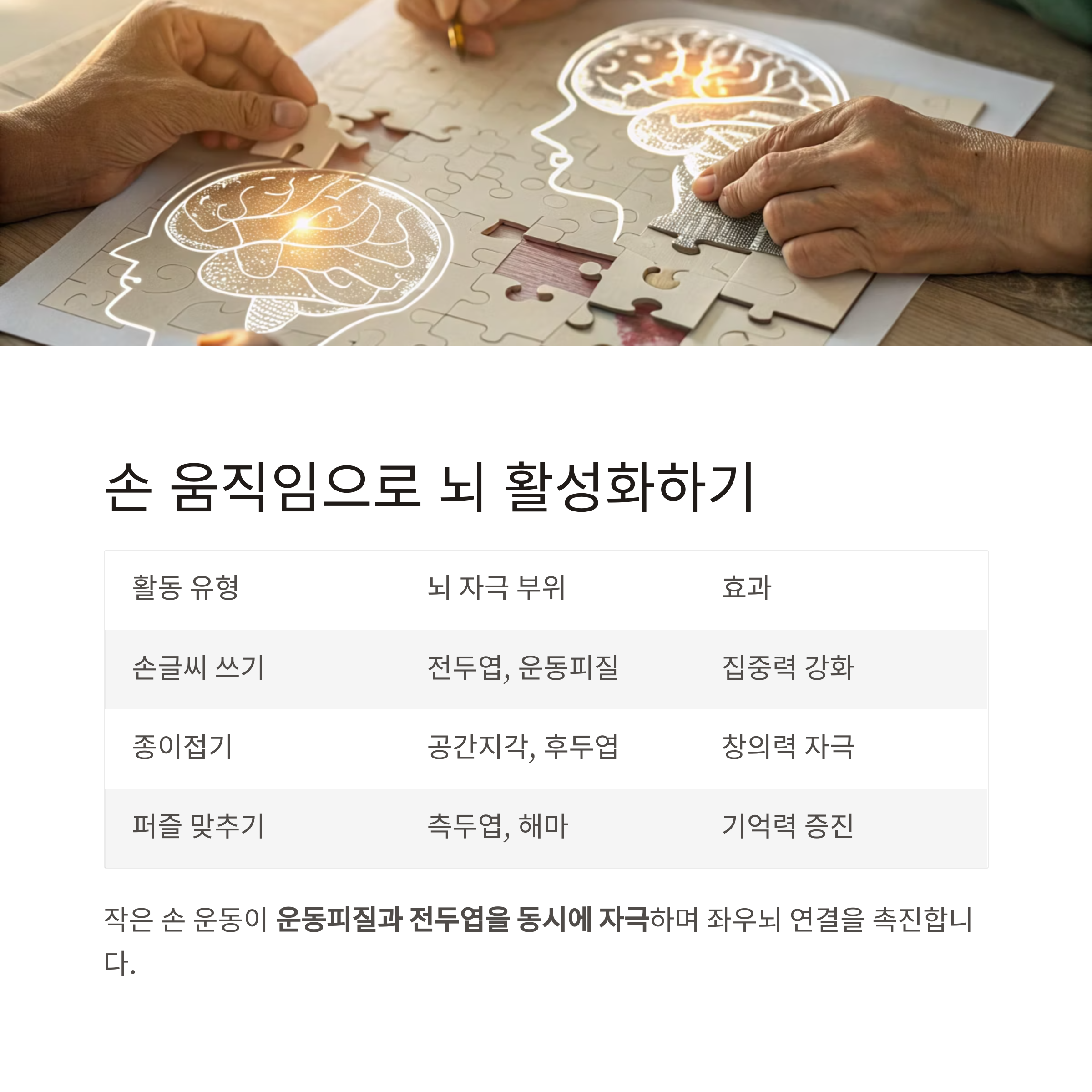 글씨를 쓰거나 퍼즐을 맞추는 행동은 운동피질과 전두엽을 동시에 자극합니다.