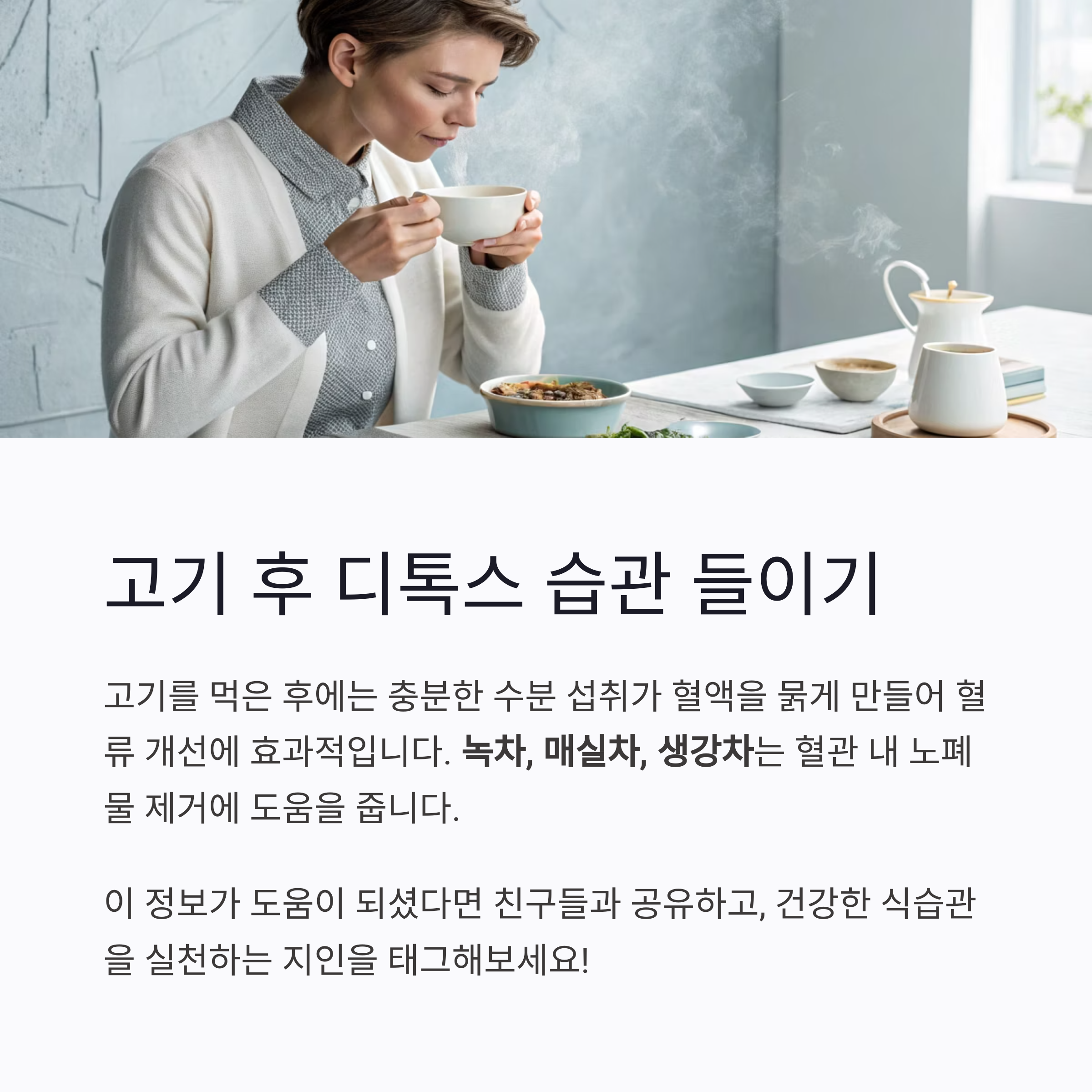 고기를 먹은 후에는 수분 섭취가 혈액을 묽게 만들어 혈류 개선에 효과적입니다