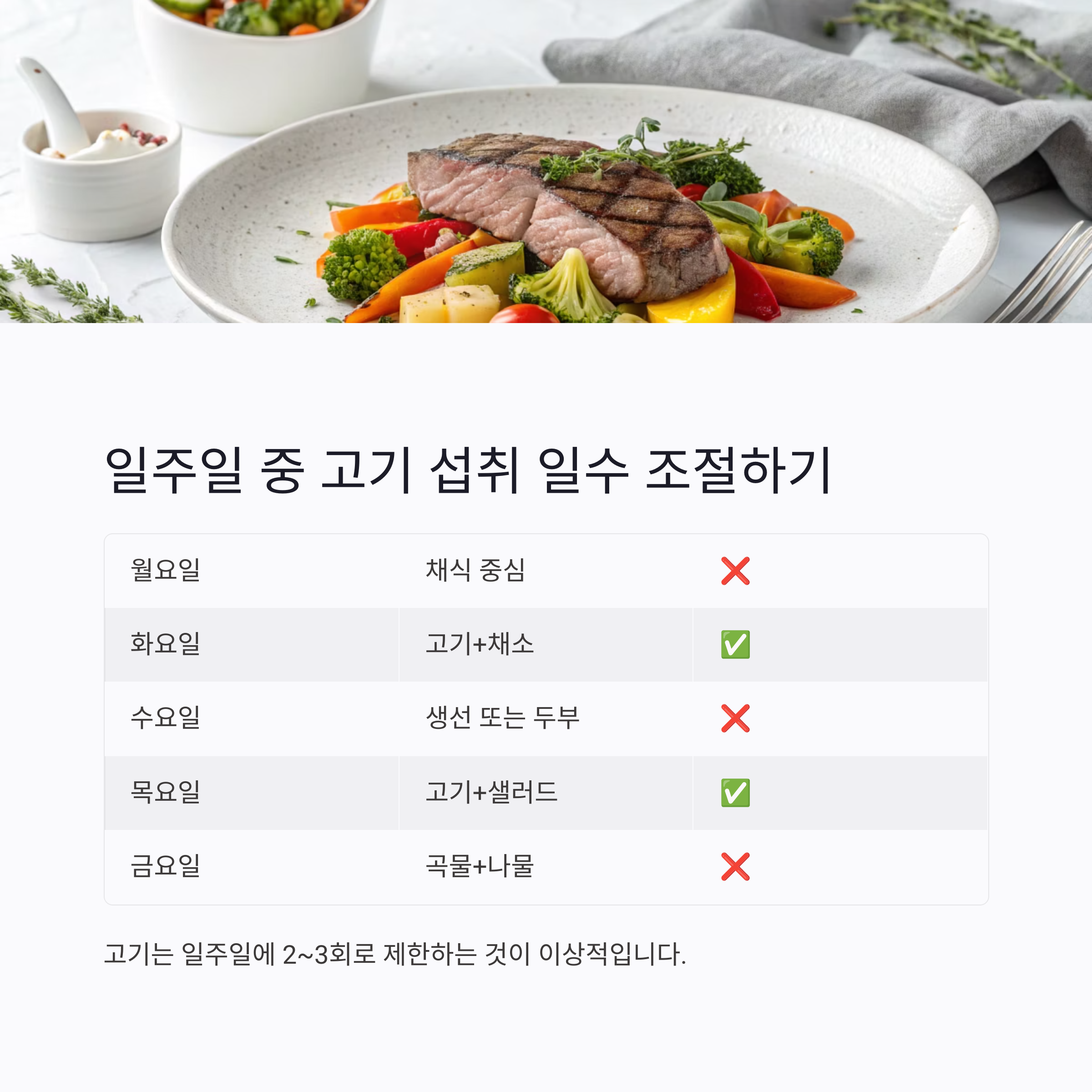 고기는 일주일에 2~3회로 제한하는 것이 이상적입니다