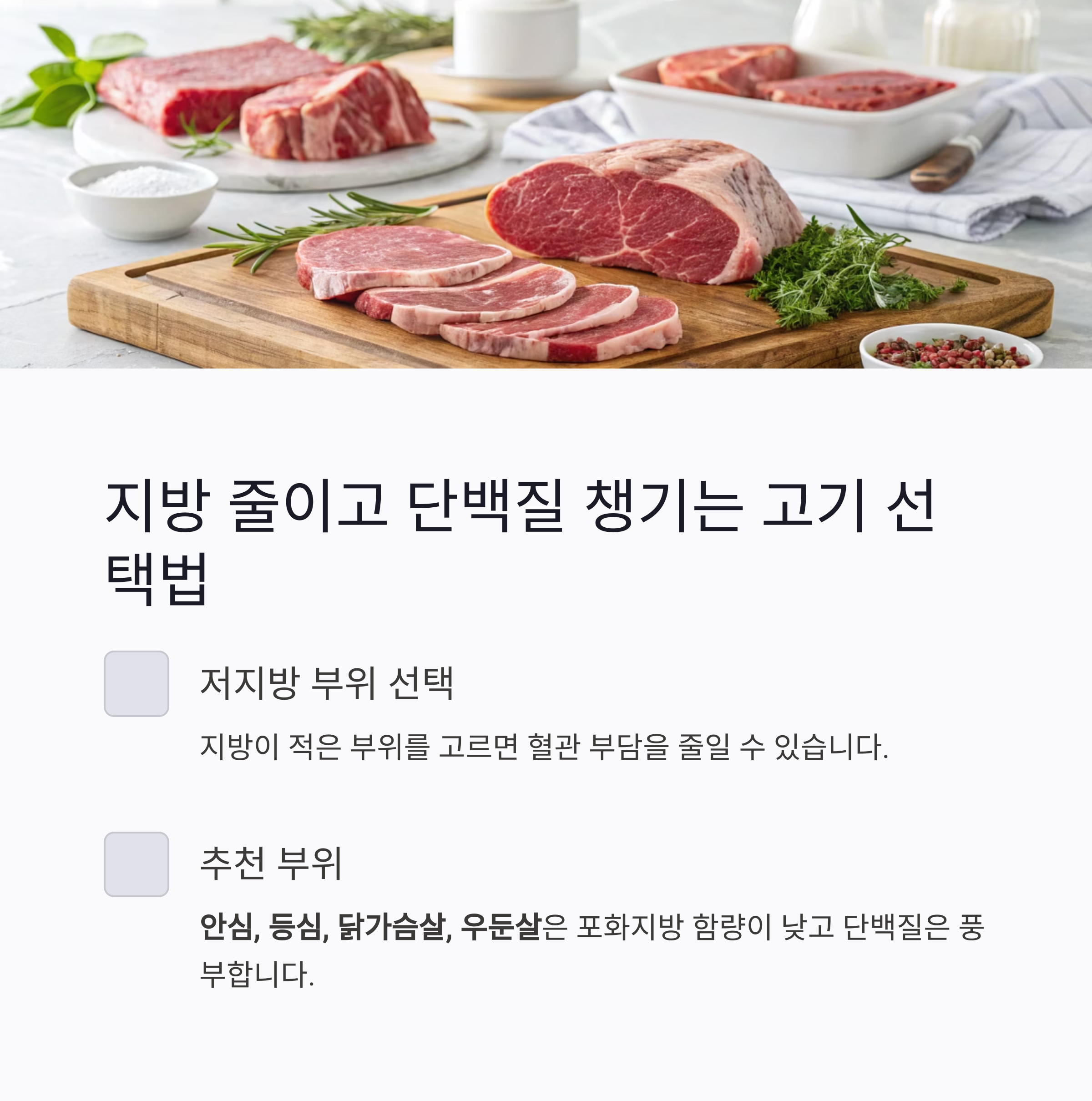 지방이 적은 부위를 고르면 혈관 부담을 줄일 수 있습니다