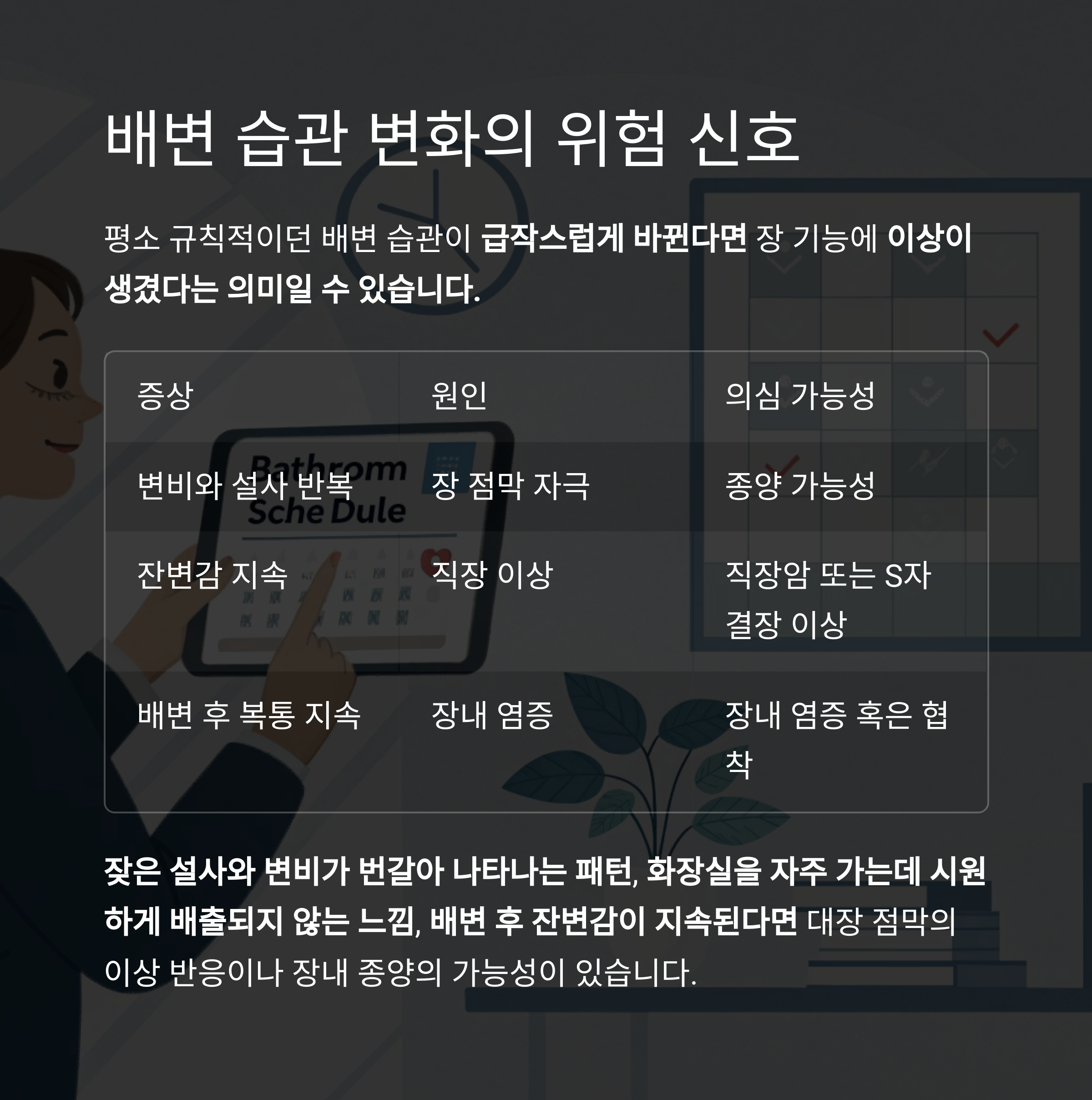 배변 습관 변화는 장 기능 이상을 시사합니다