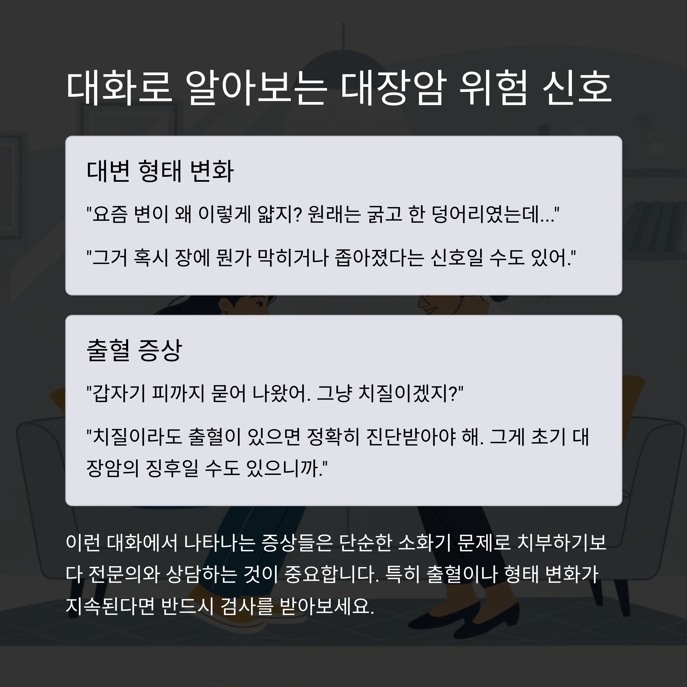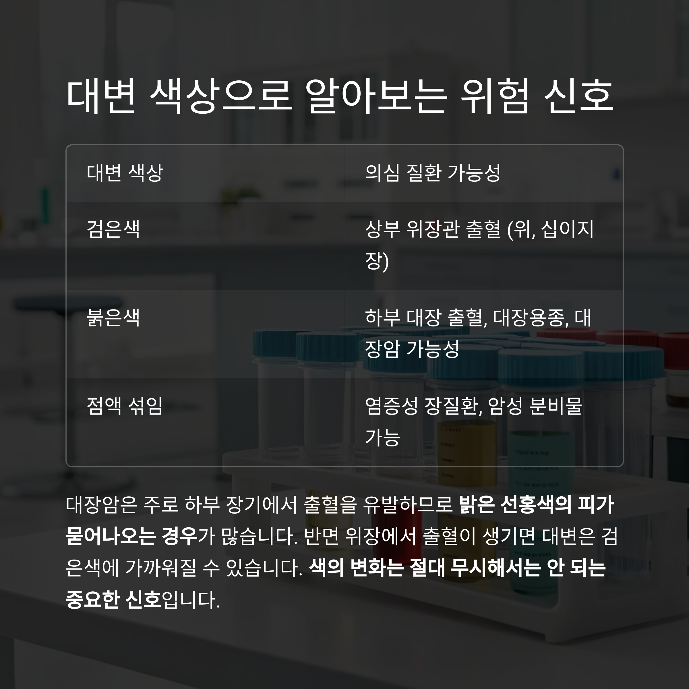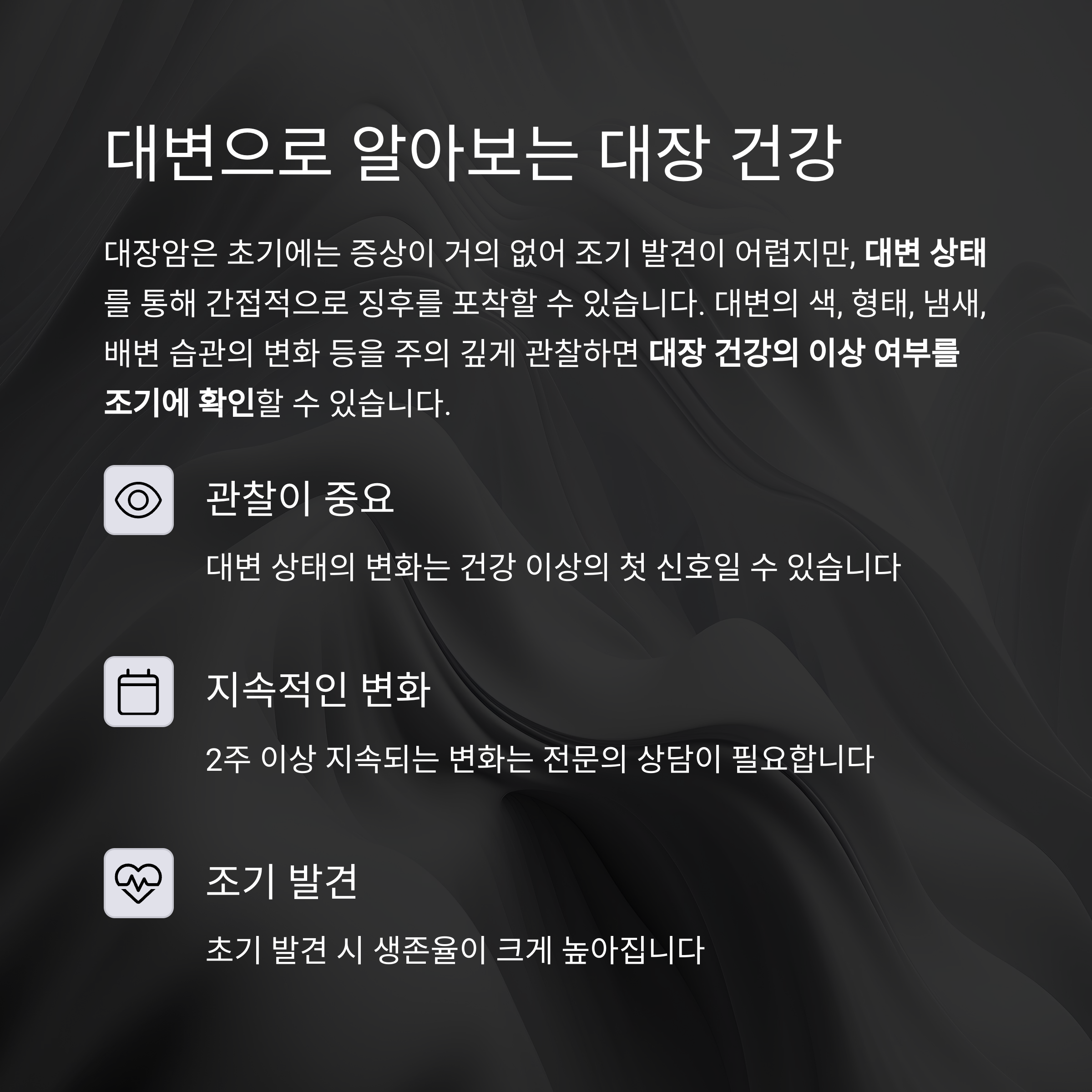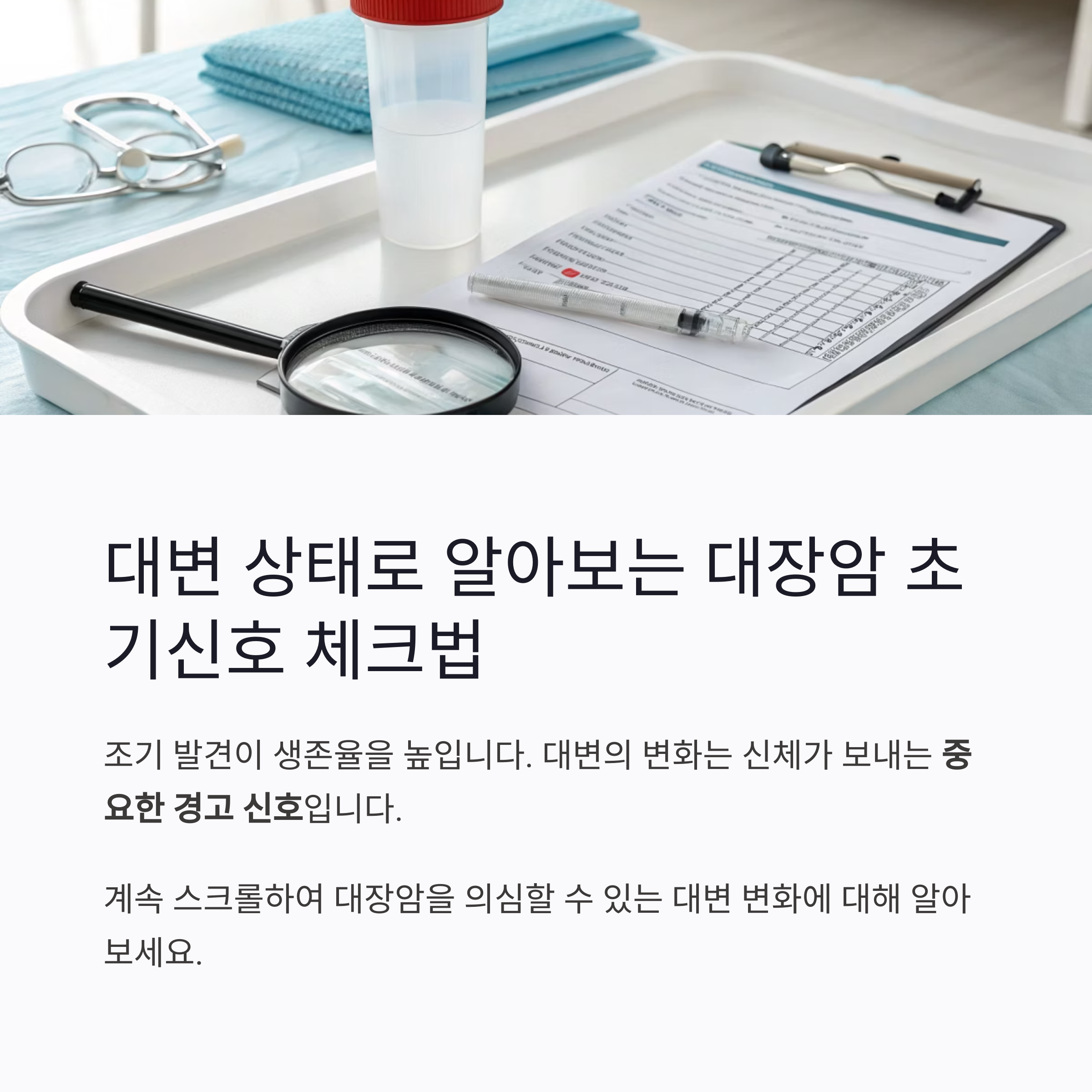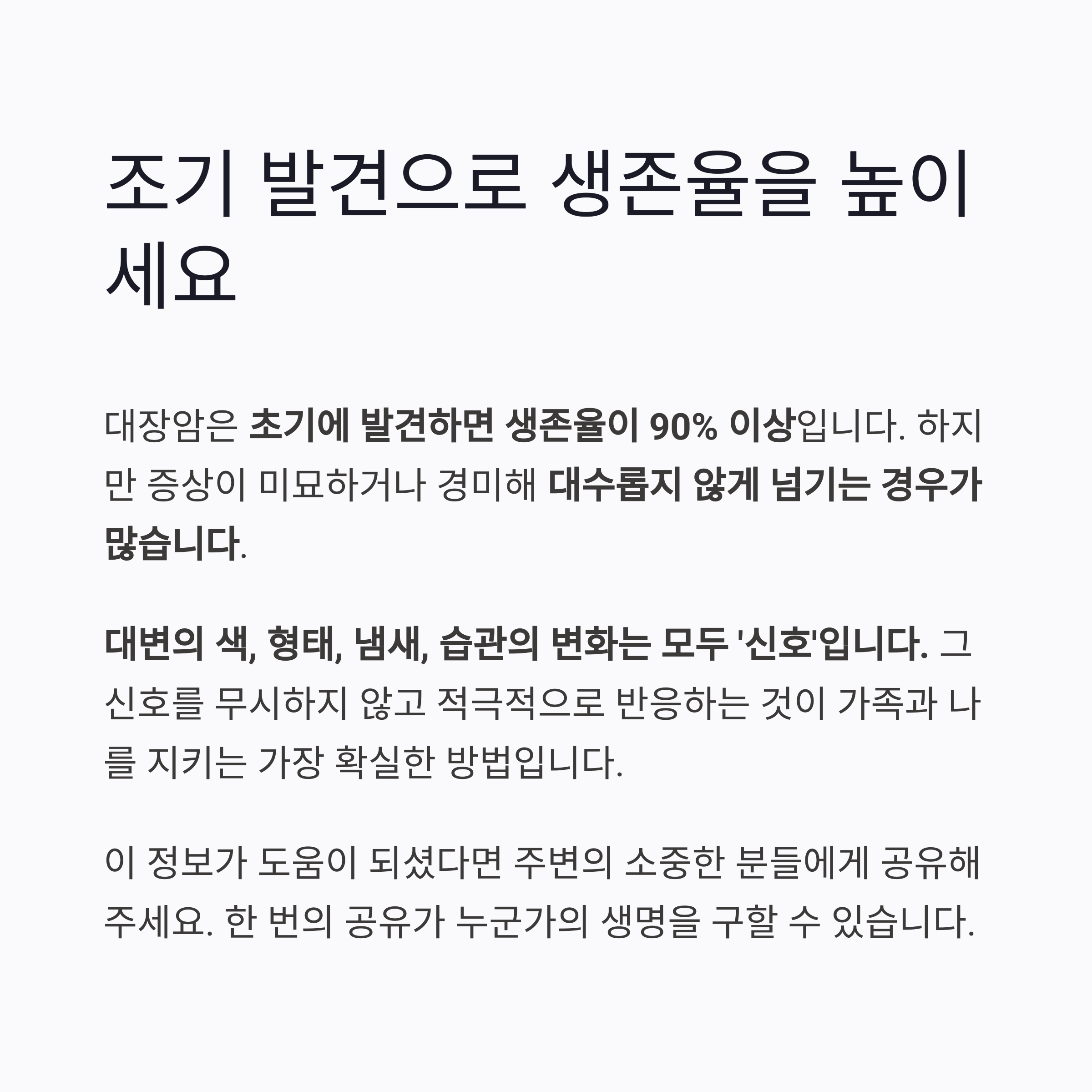 조기 발견이 생존율을 높입니다. 대변의 변화는 신체가 보내는 중요한 경고 신호입니다.