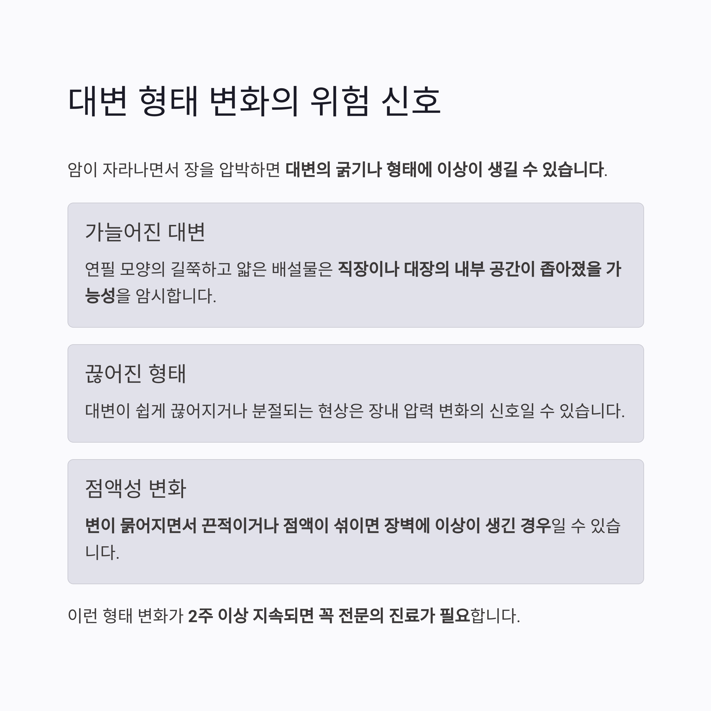 | 점액 섞임 | 염증성 장질환, 암성 분비물 가능 |