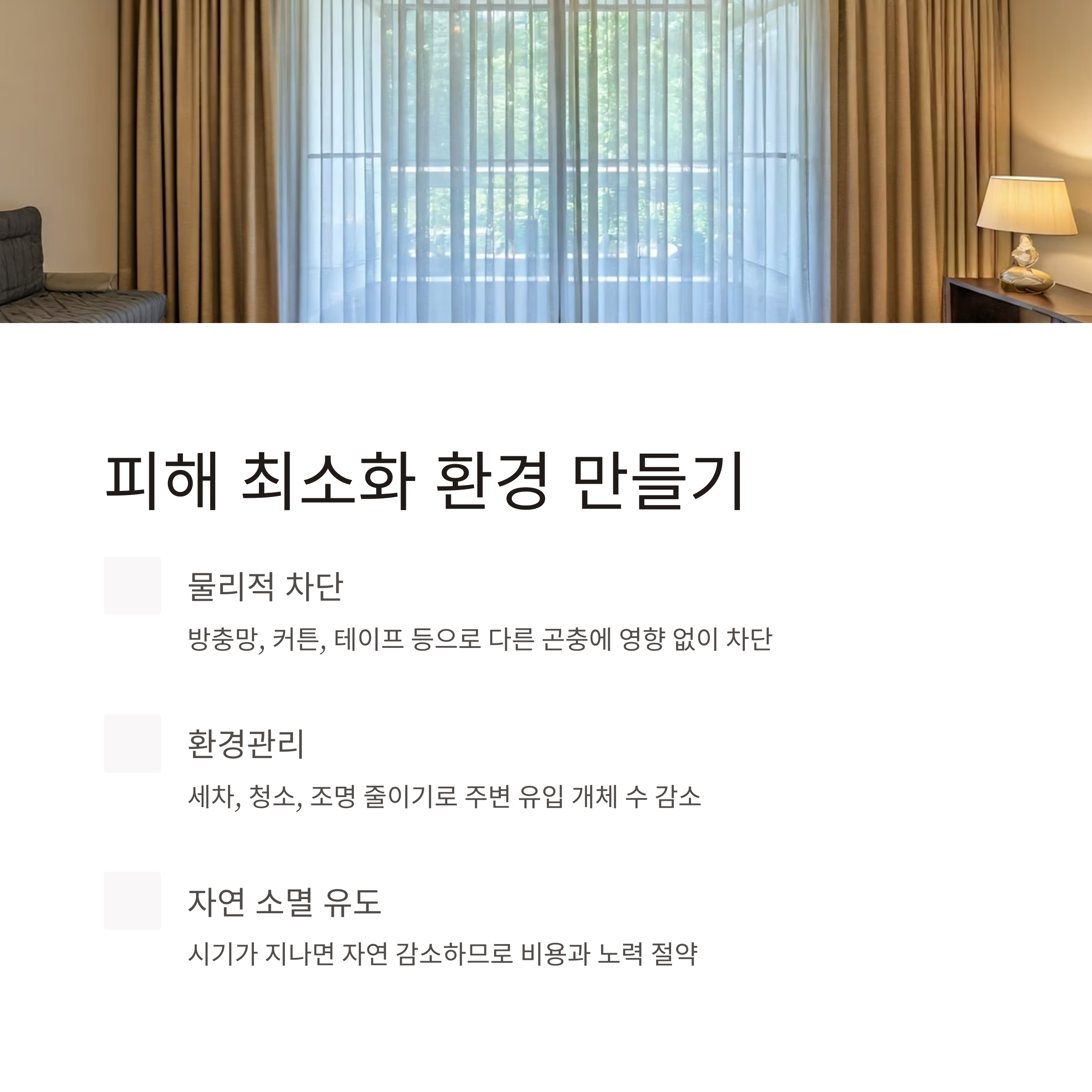 물리적 차단 | 방충망, 커튼, 테이프 등 | 다른 곤충에 영향 없음 |