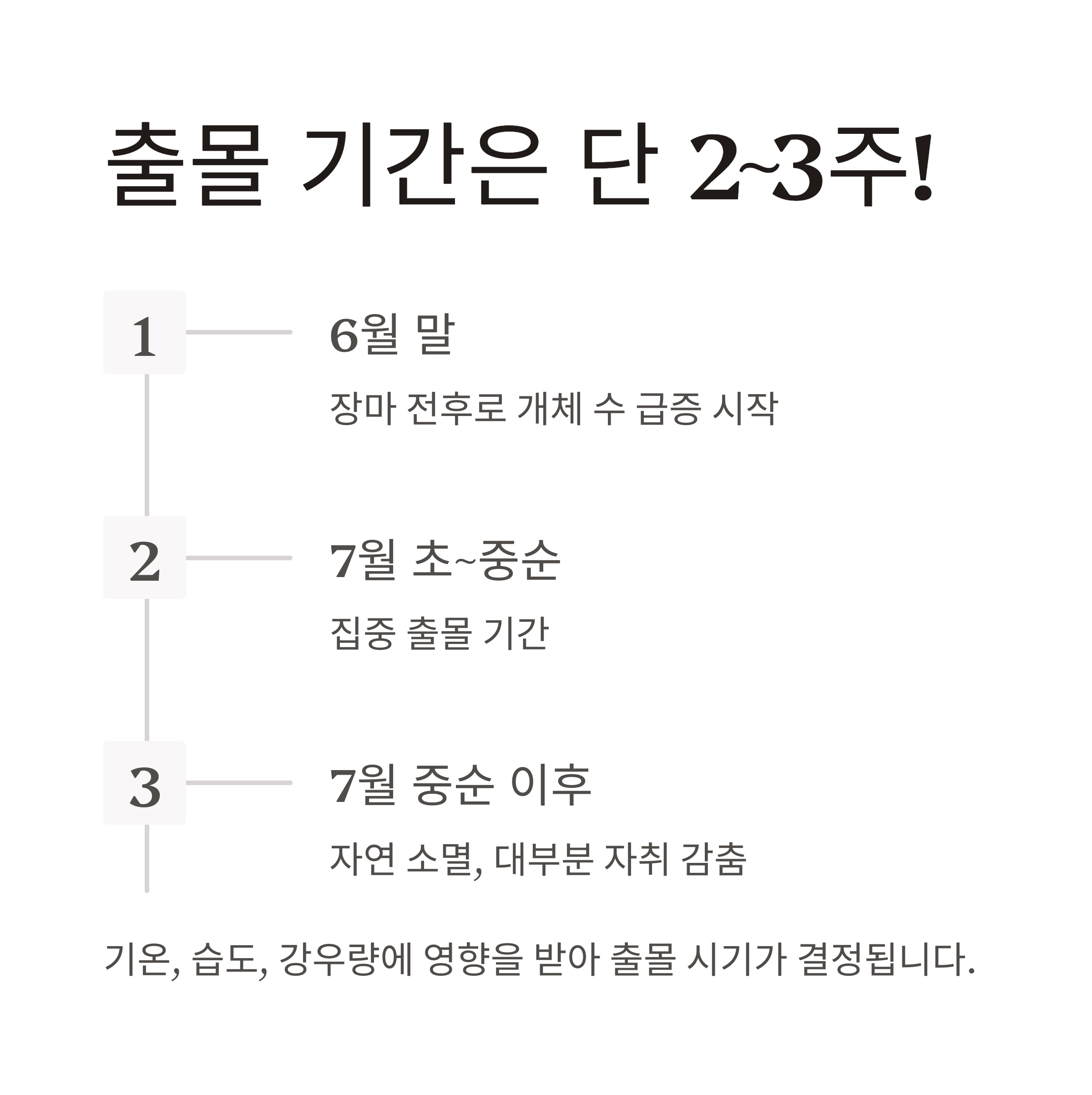 러브버그는 6월 말부터 7월 중순까지 집중적으로 발생합니다. 기온, 습도, 강우량 등에 영향을 받으며 특히 장마 전후로 개체 수가 늘어납니다. 보통은 2~3주 내로 자연 소멸되며, 7월 중순 이후에는 대부분 자취를 감추기 때문에 조금만 더 참고 기다리면 불편함은 줄어들 가능성이 큽니다.