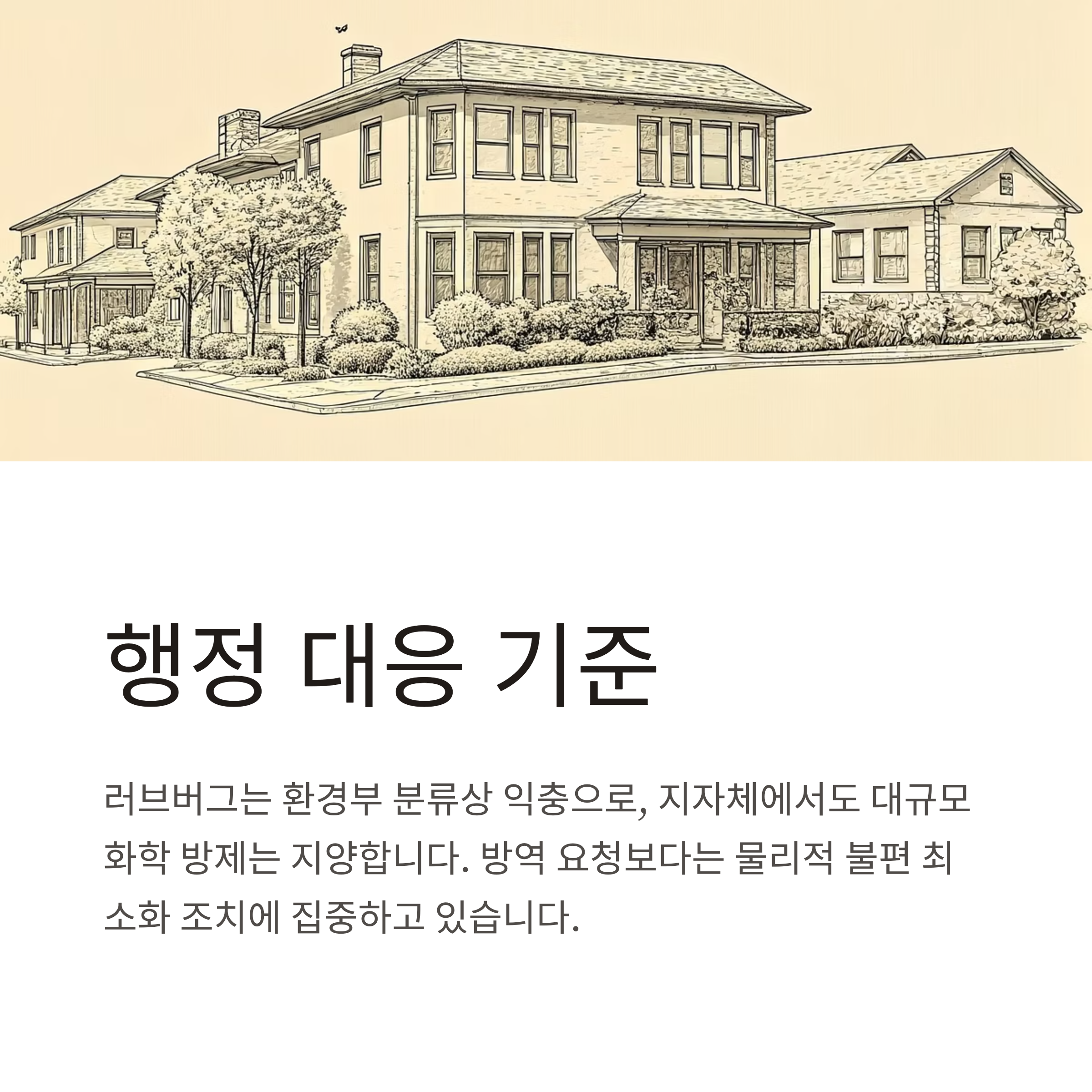 러브버그는 환경부 분류상 익충으로 간주되며, 지자체에서도 대규모 화학 방제는 지양하고 있습니다. 방역 요청이 불가능한 것은 아니나, 대부분의 시군구청은 방제보다는 물리적 불편 최소화 조치에 집중하고 있습니다.