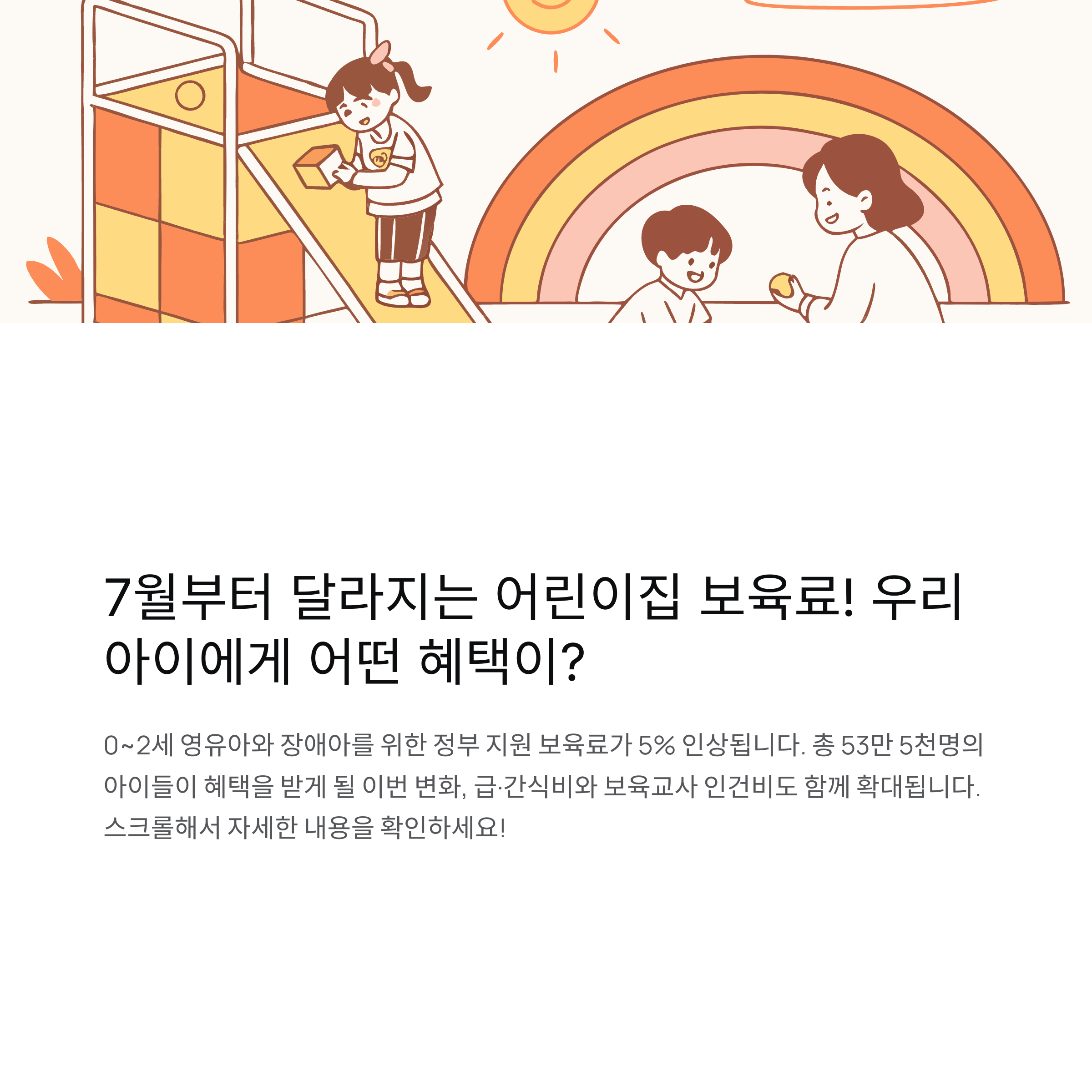 이번 7월부터 어린이집에 다니는 0~2세 영유아와 장애아를 위한 정부 지원 보육료가 인상됩니다. 교육부는 이번 추경을 통해 총 53만 5000명의 아이들에게 인상된 보육료를 적용하게 되며, 급·간식비와 보육교사 인건비 등도 함께 확대됩니다. 어떤 변화가 있는지, 부모가 체감할 수 있는 혜택은 무엇인지 자세히 알아보겠습니다.