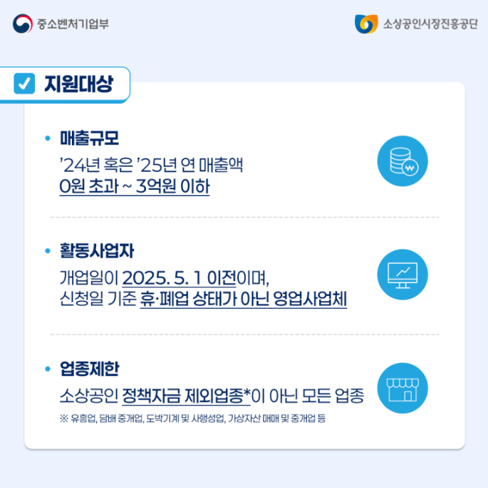 | 신청 대상 | 연매출 3억 원 이하 소상공인 |
