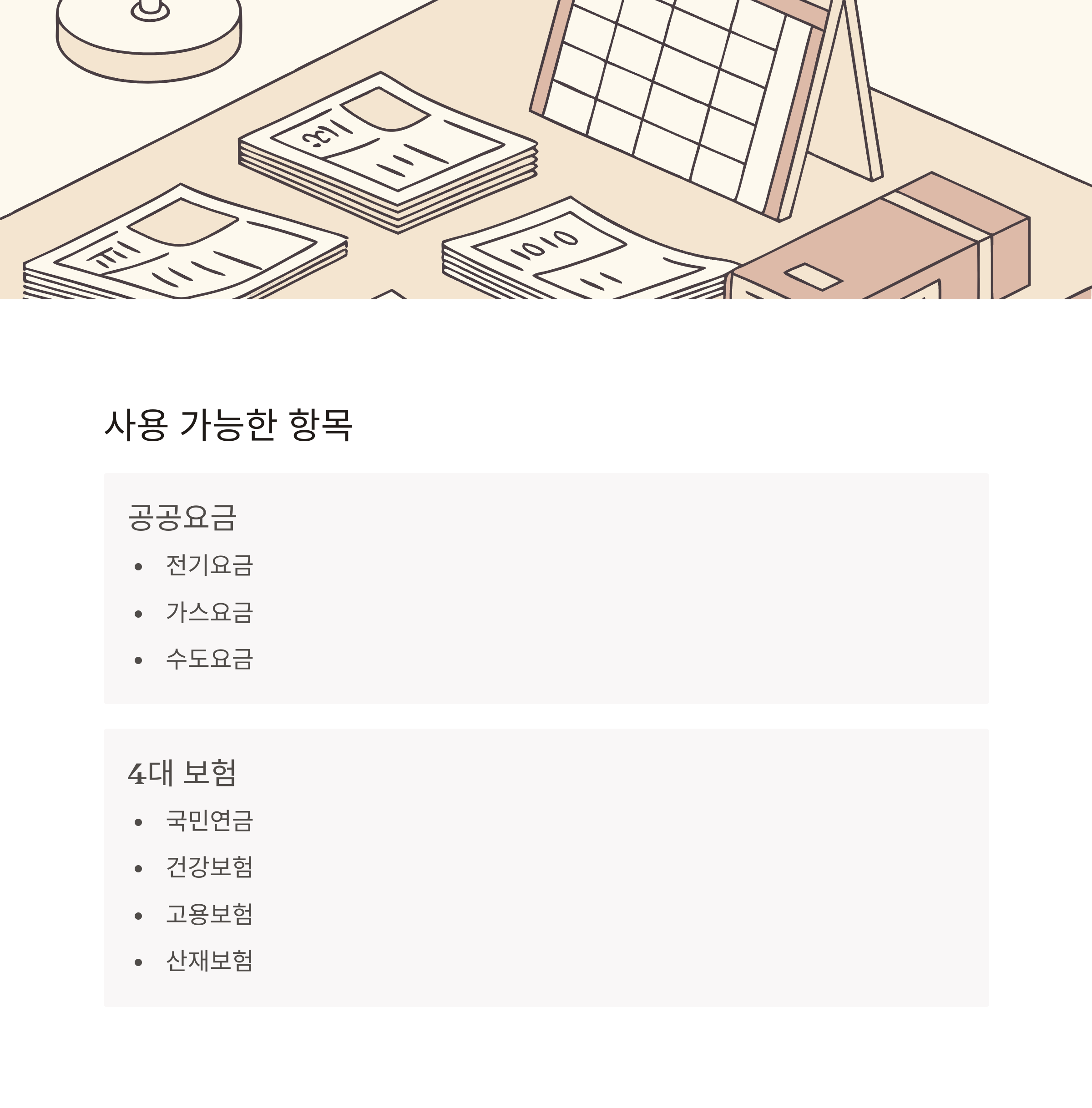 | 공공요금 | 전기, 가스, 수도 등 |