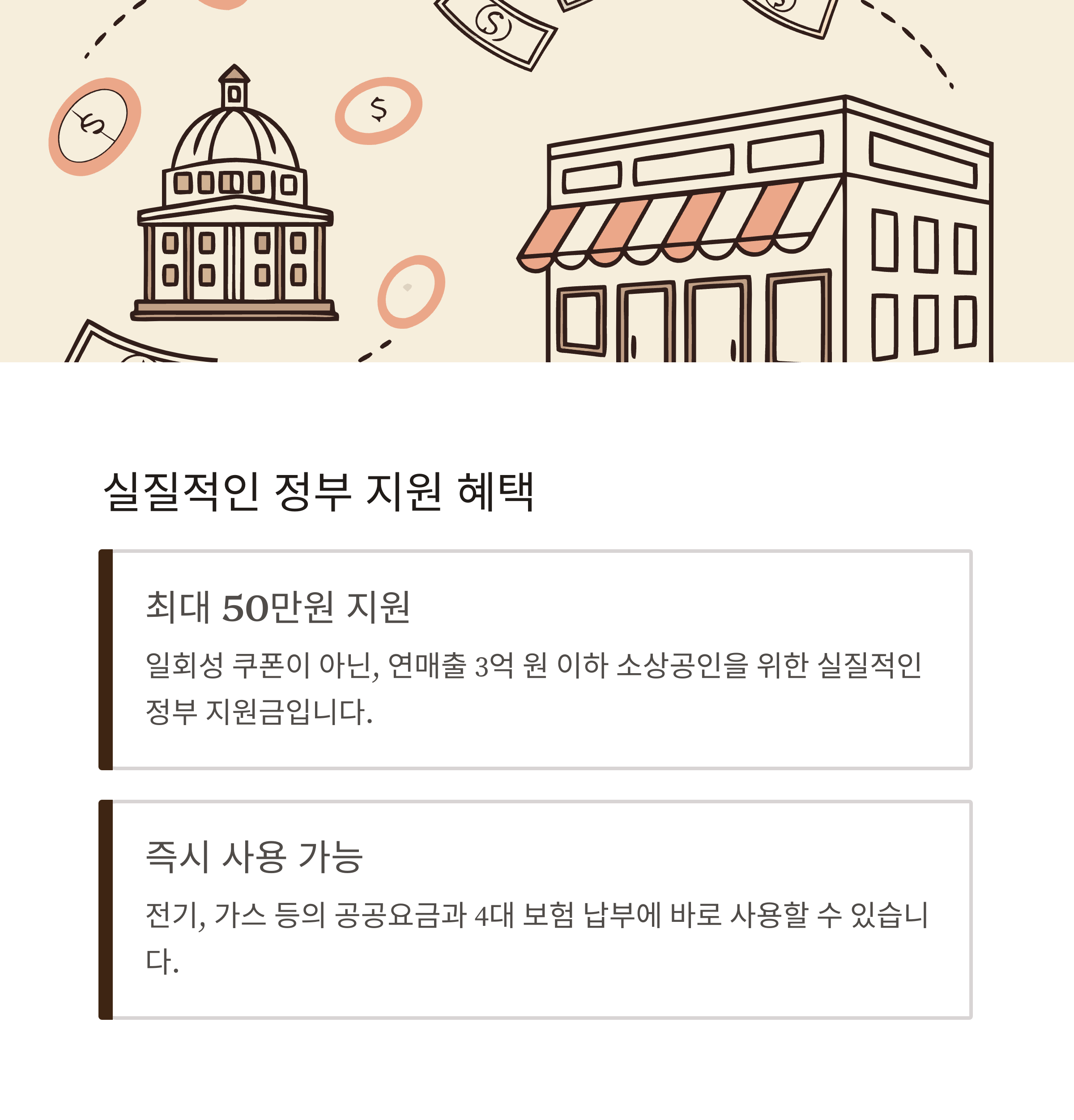 연매출 3억 원 이하 소상공인에게 최대 50만 원 상당의 혜택을 제공하며,
