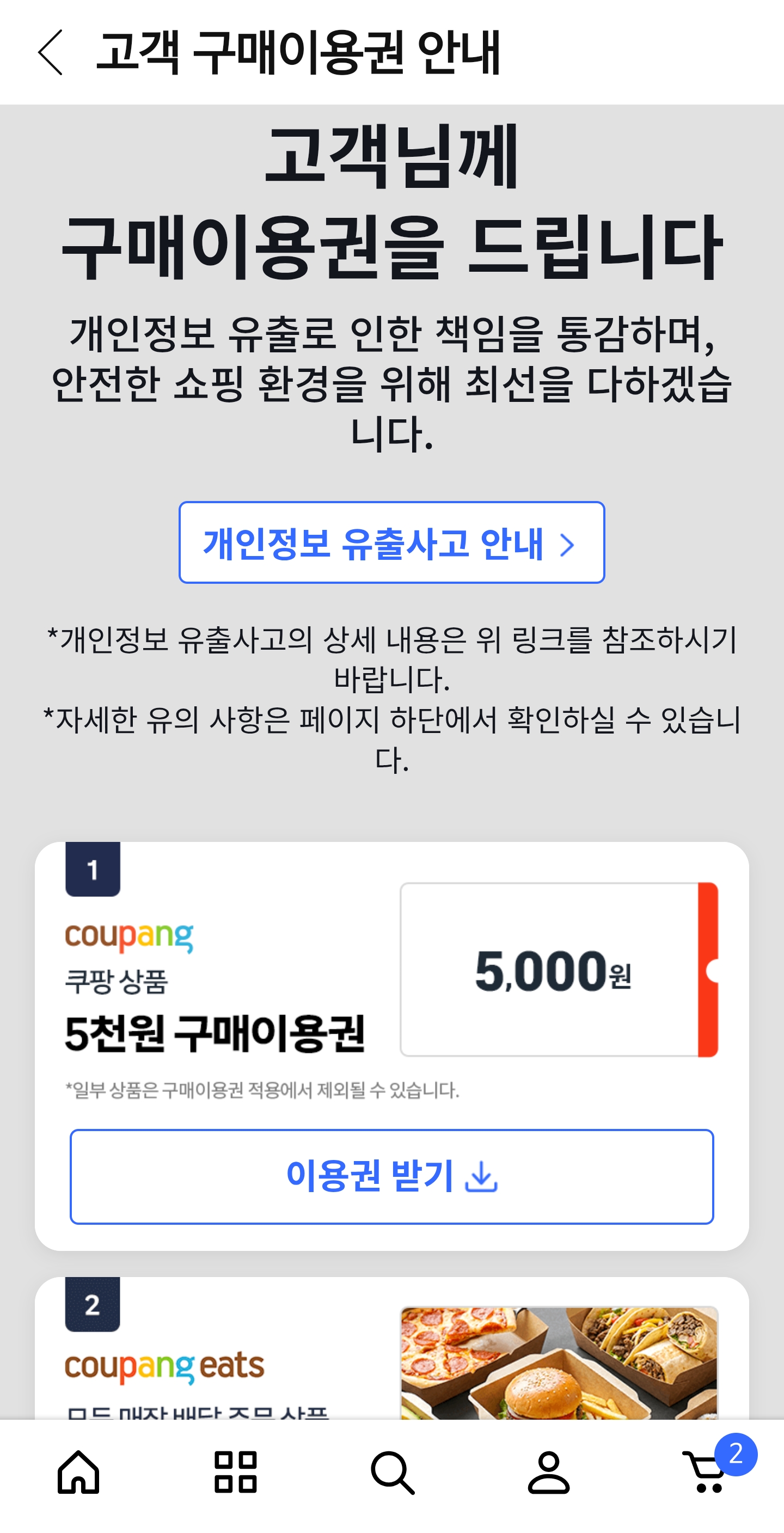 보상은 유출 대상 고객에게만 주어지며, 쿠팡에서 개별적으로 문자 및 이메일을 통해 통지되었습니다.